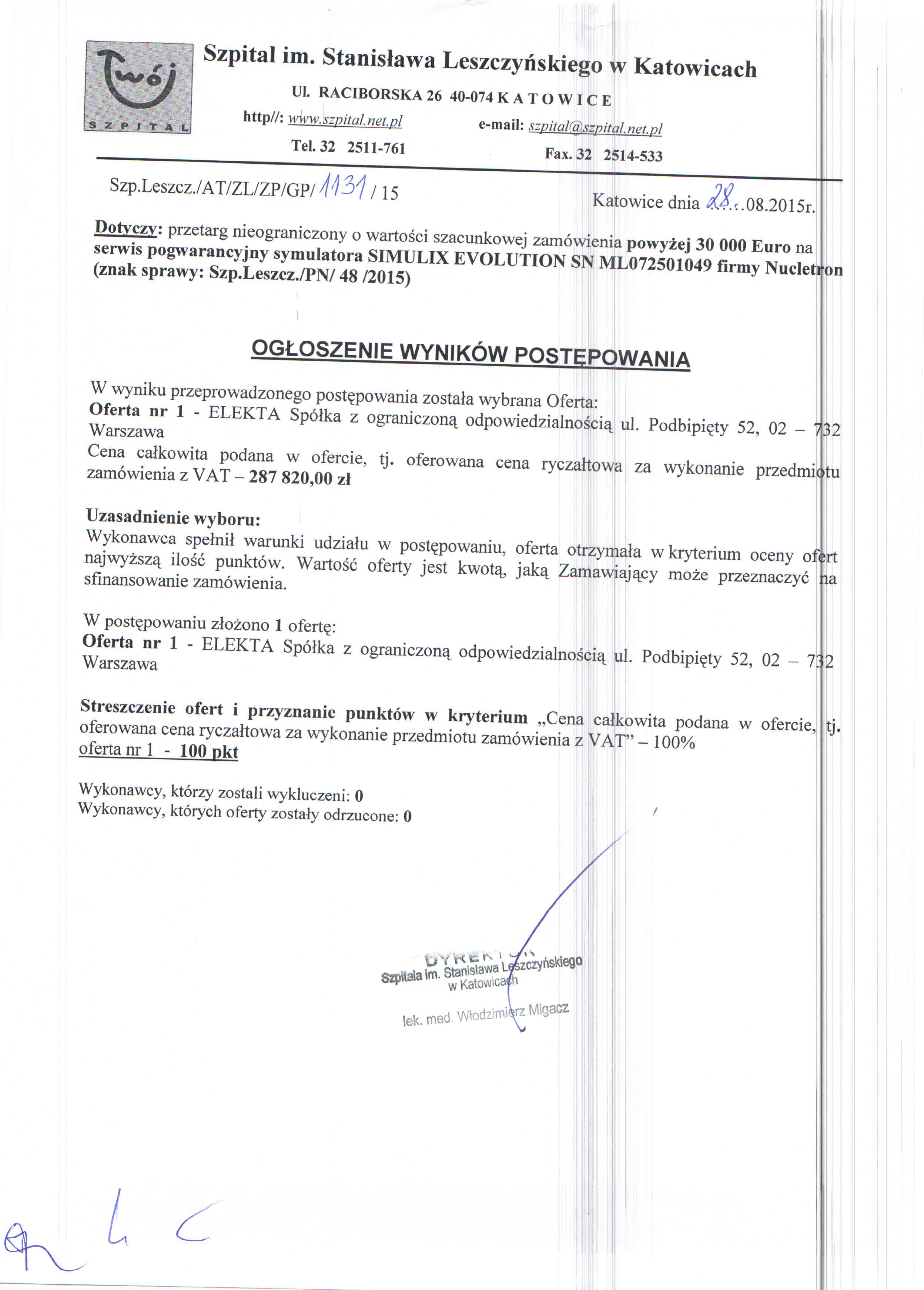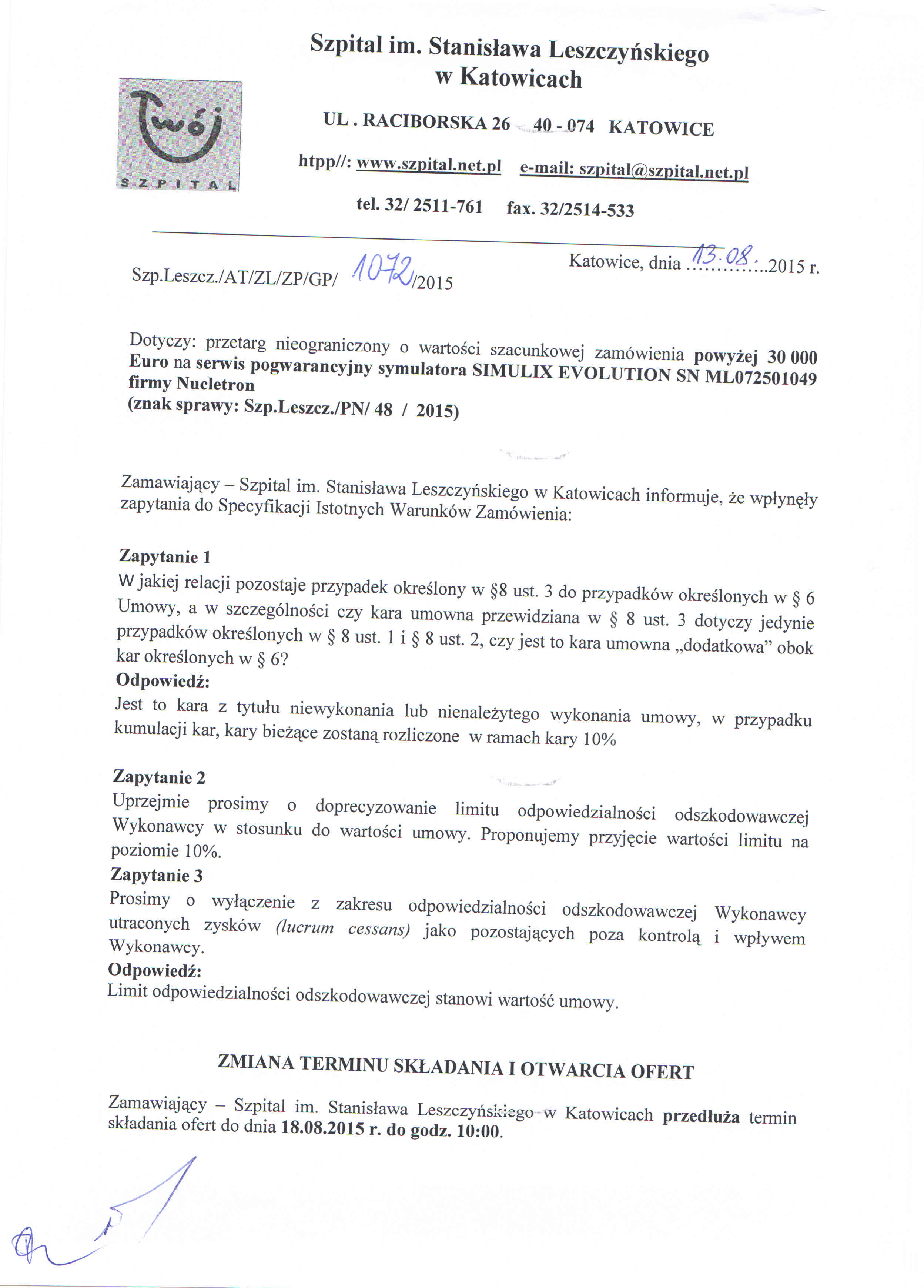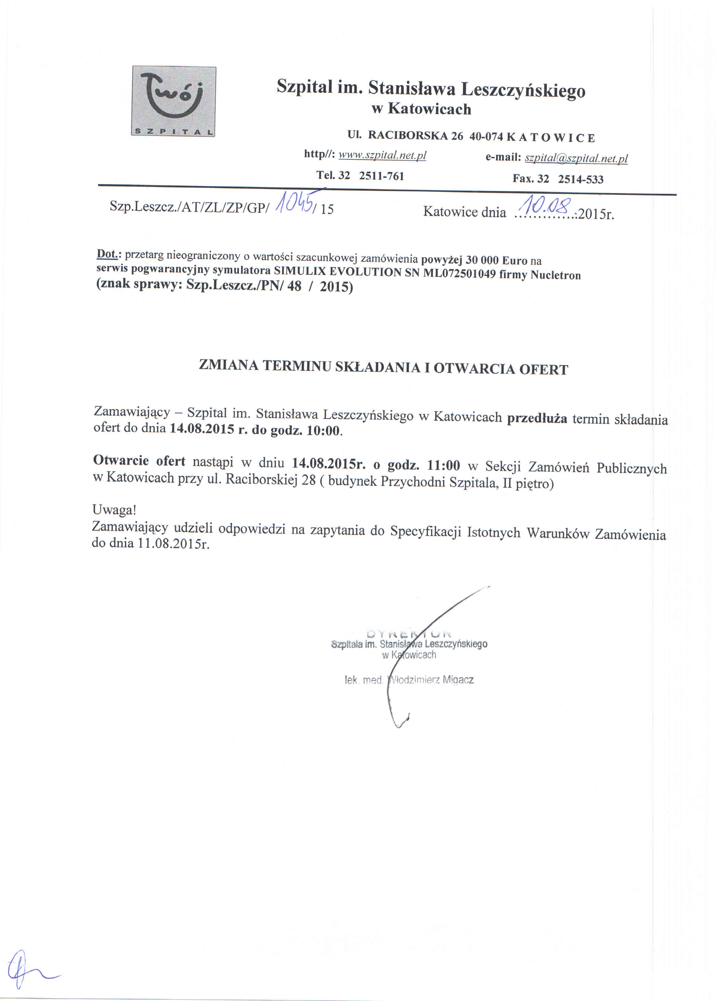 do dnia 11.08.2015r. do godz. 10:00 w Szpitalu im. Stanisława Leszczyńskiego w Katowicach ul. Raciborska 26 – Kancelaria Dyrektora, I piętro.
