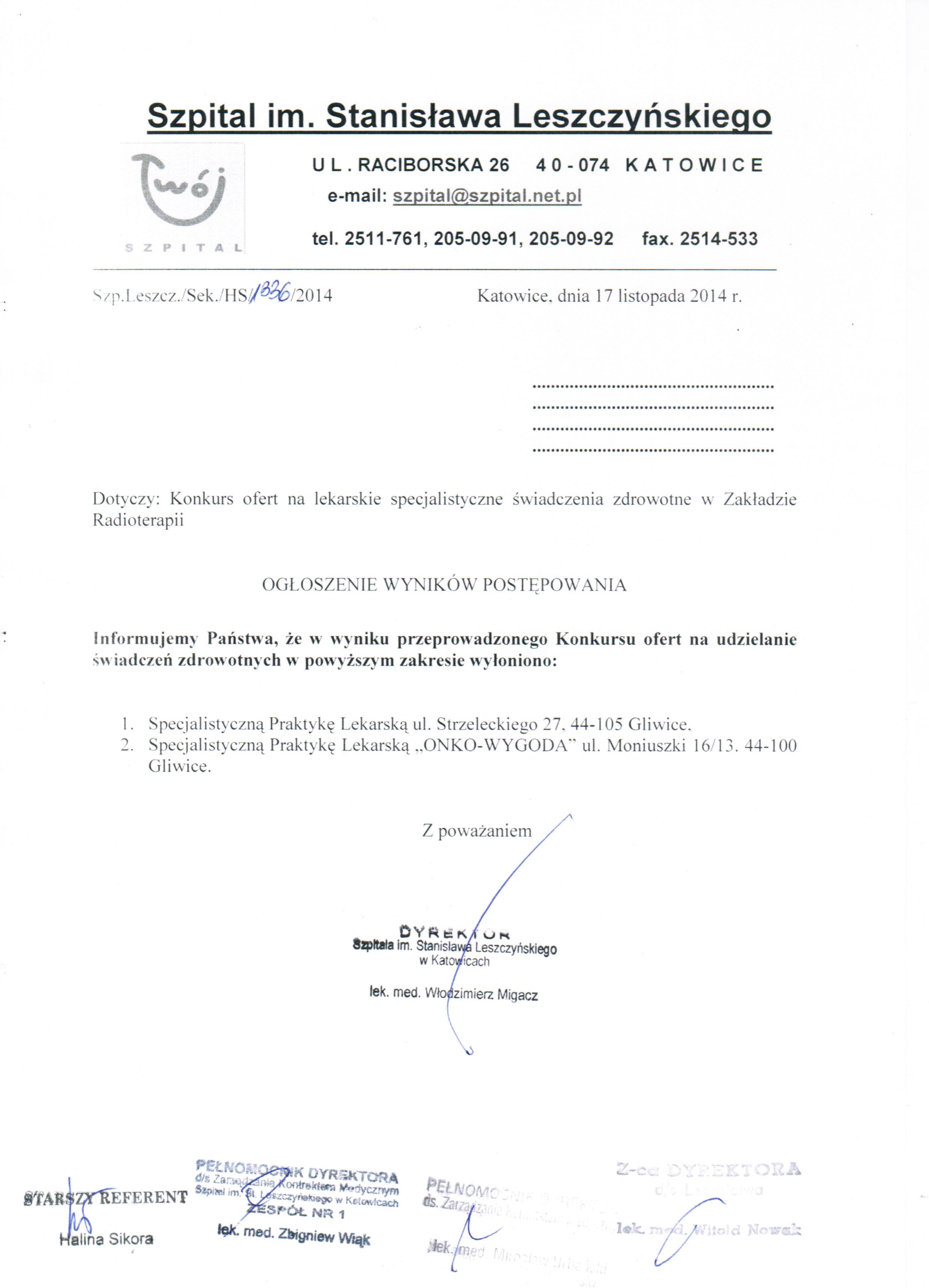 Szpital im. Stanisława Leszczyńskiego w Katowicach ul. Raciborska 26 zwany dalej Udzielającym Zamówienia ogłasza zamówienie na udzielanie lekarskich specjalistycznych świadczeń zdrowotnych w Zakładzie Radioterapii.