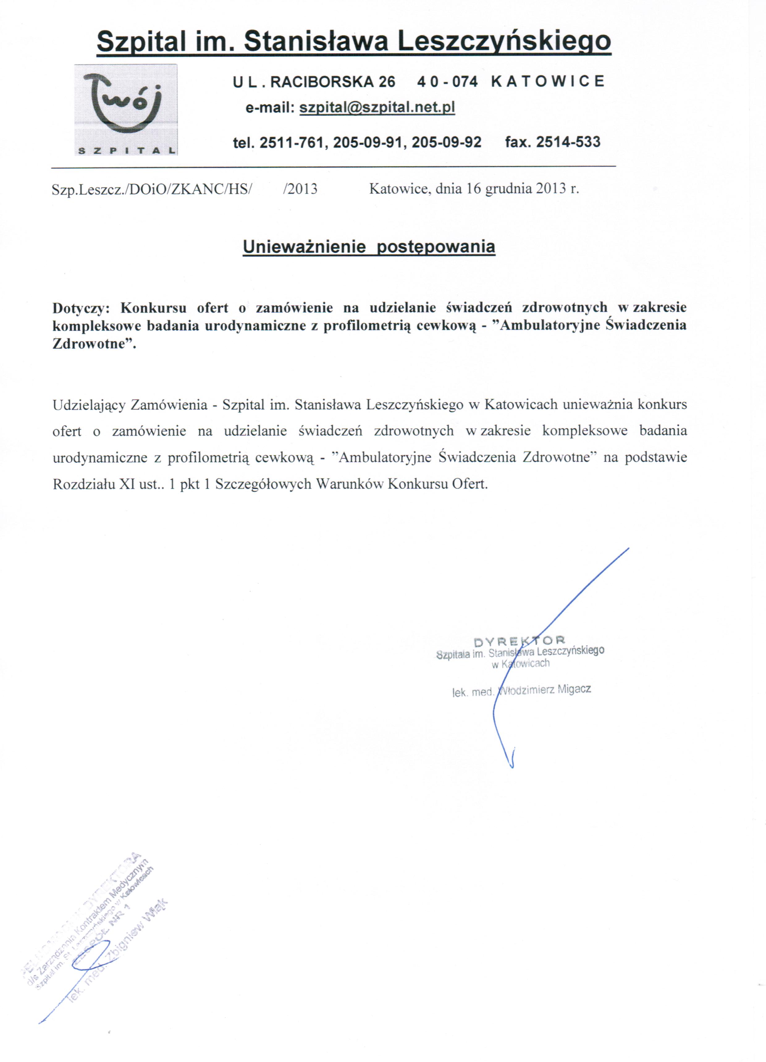 - Oferty należy składać w Kancelarii Szpitala im. Stanisława Leszczyńskiego w Katowicach ul. Raciborska 26 do dnia 16.12.2013 do godz. 10.00.