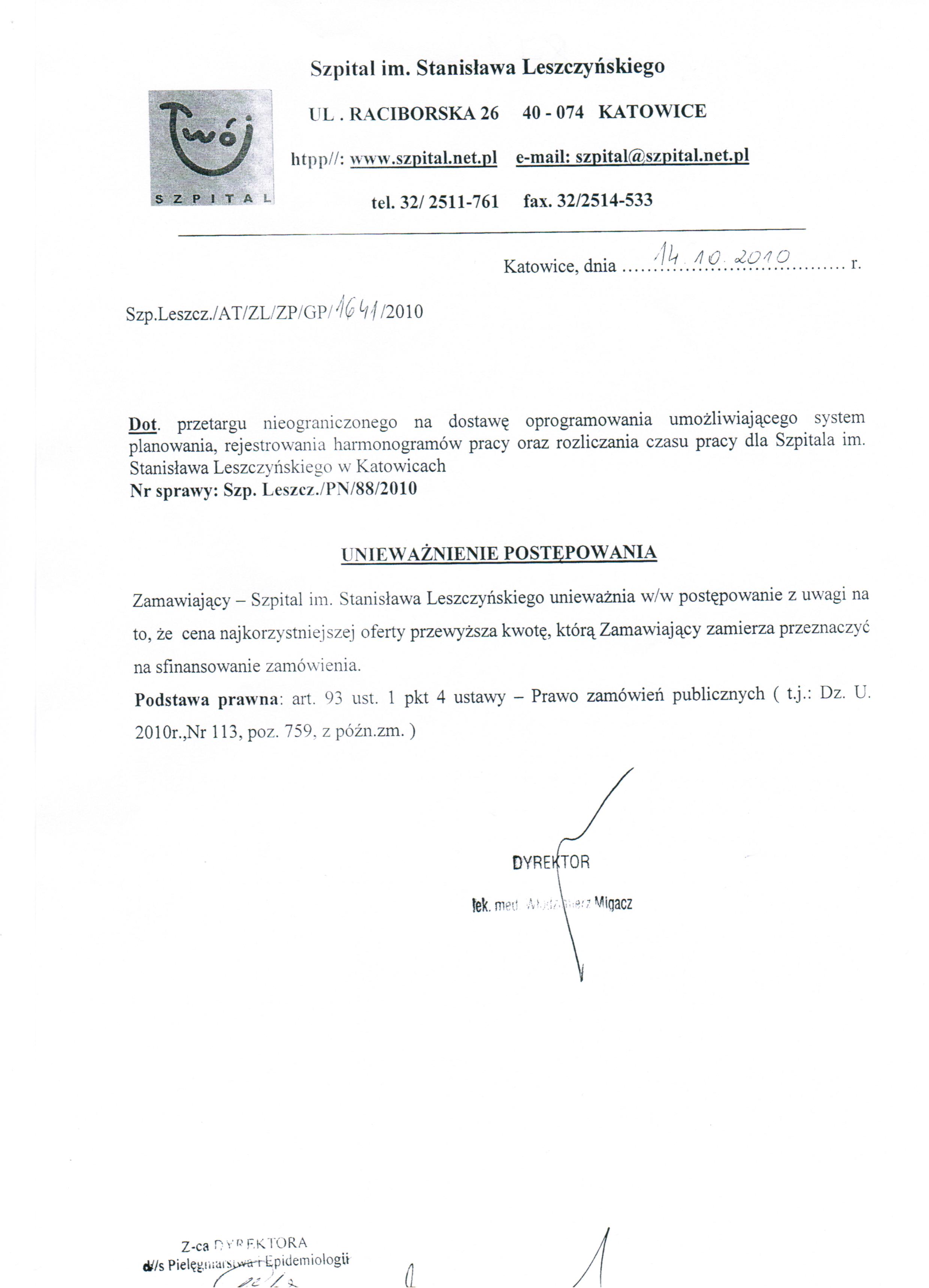 w dniu 12.10.2010r. o godz. 11:00 w budynku Przychodni Szpitala w Katowicach przy ul. Raciborskiej 28 (II piętro, Sekcja Zamówień Publicznych)