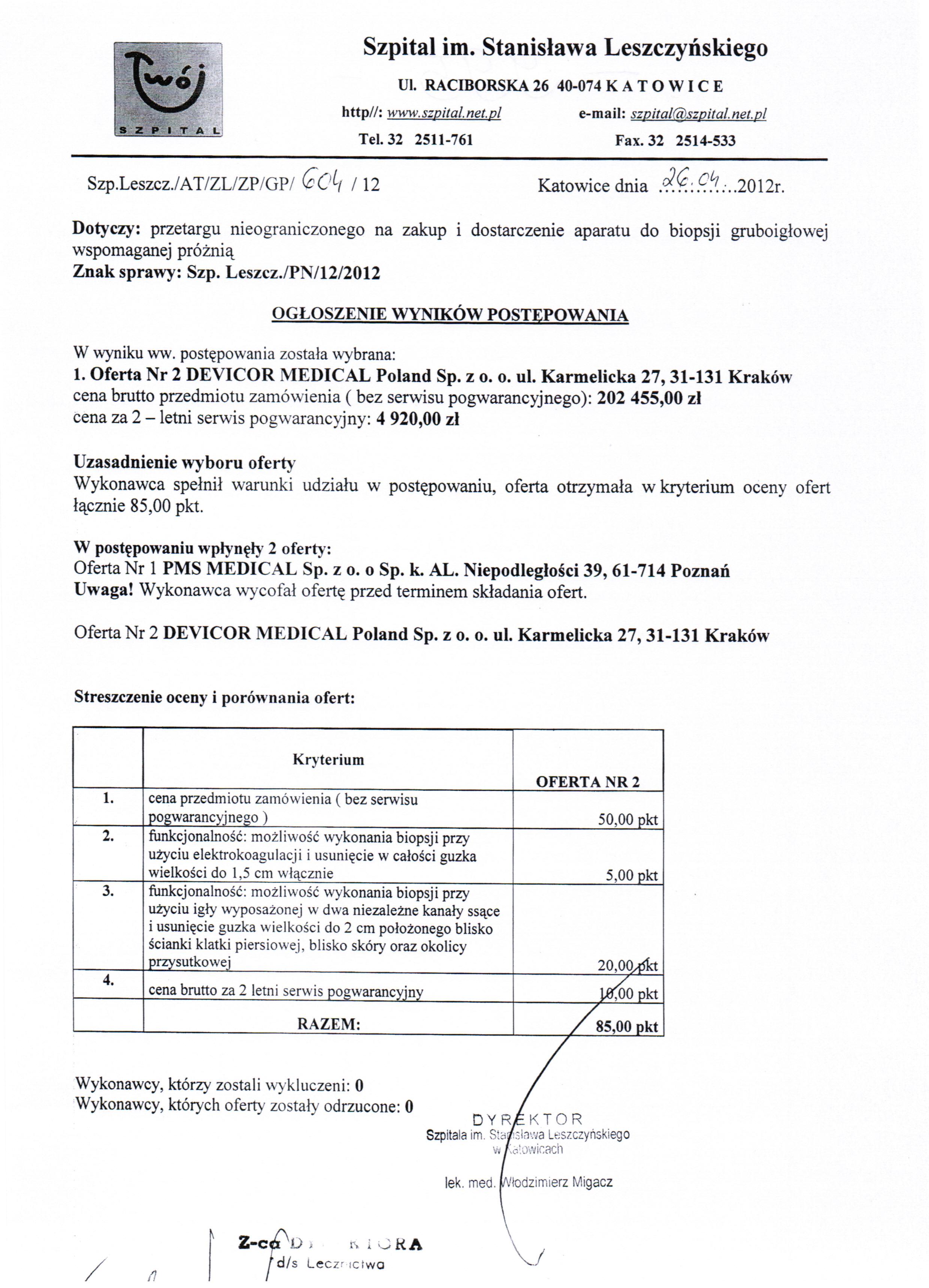 Ogłoszenie wyników postępowania - 26.IV.2012r.