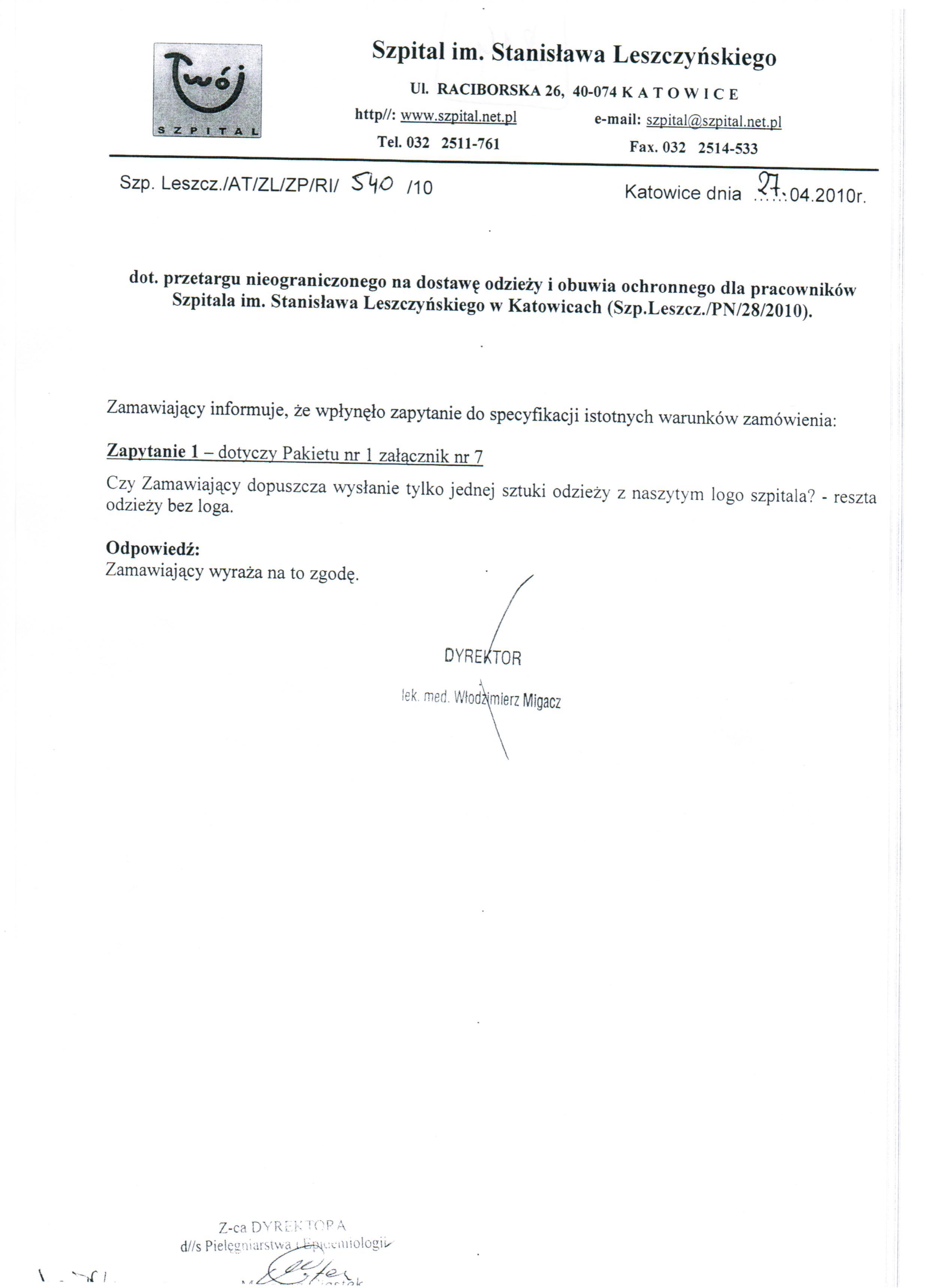ogłasza przetarg nieograniczony o wartości szacunkowej zamówienia powyżej 14.000 EURO na dostawę odzieży i obuwia ochronnego dla pracowników Szpitala