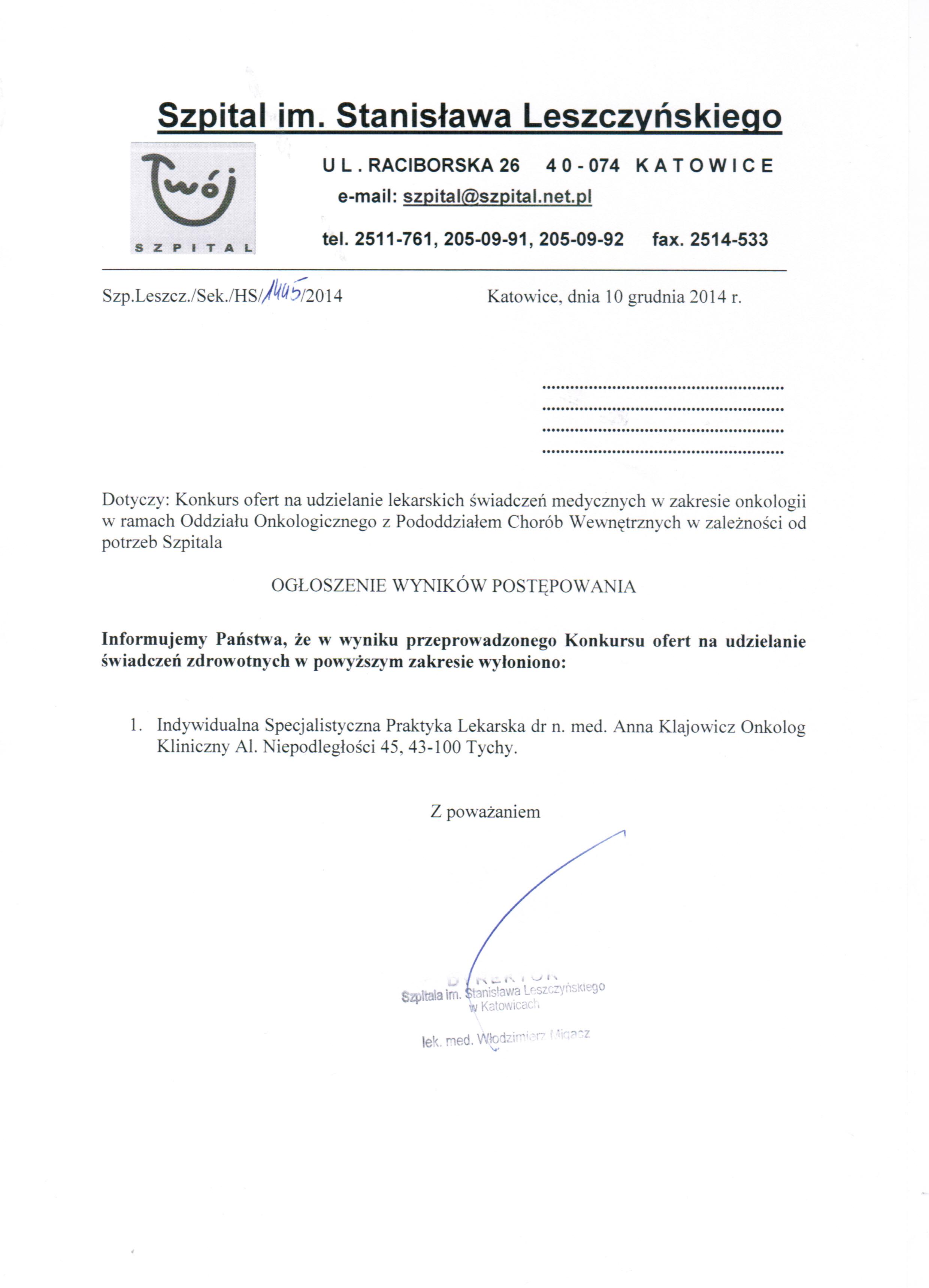 Szpital im. Stanisława Leszczyńskiego w Katowicach ul. Raciborska 26 zwany dalej Udzielającym Zamówienia ogłasza zamówienie na udzielanie lekarskich świadczeń zdrowotnych w zakresie onkologii w ramach Oddziału Onkologicznego z Pododdziałem Chorób Wewnętrznych w zależności od potrzeb Szpitala.