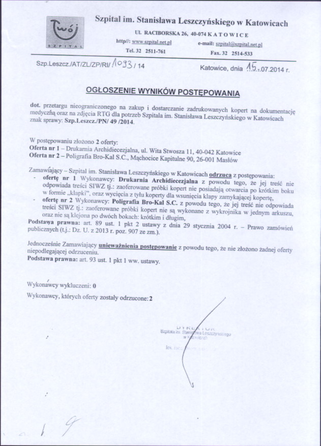 w dniu 11.07.2014 r. o godz. 11:00 w Szpitalu im. Stanisława Leszczyńskiego w Katowicach, ul. Raciborska 28, budynek Przychodni, II piętro, Sekcja Zamówień Publicznych.