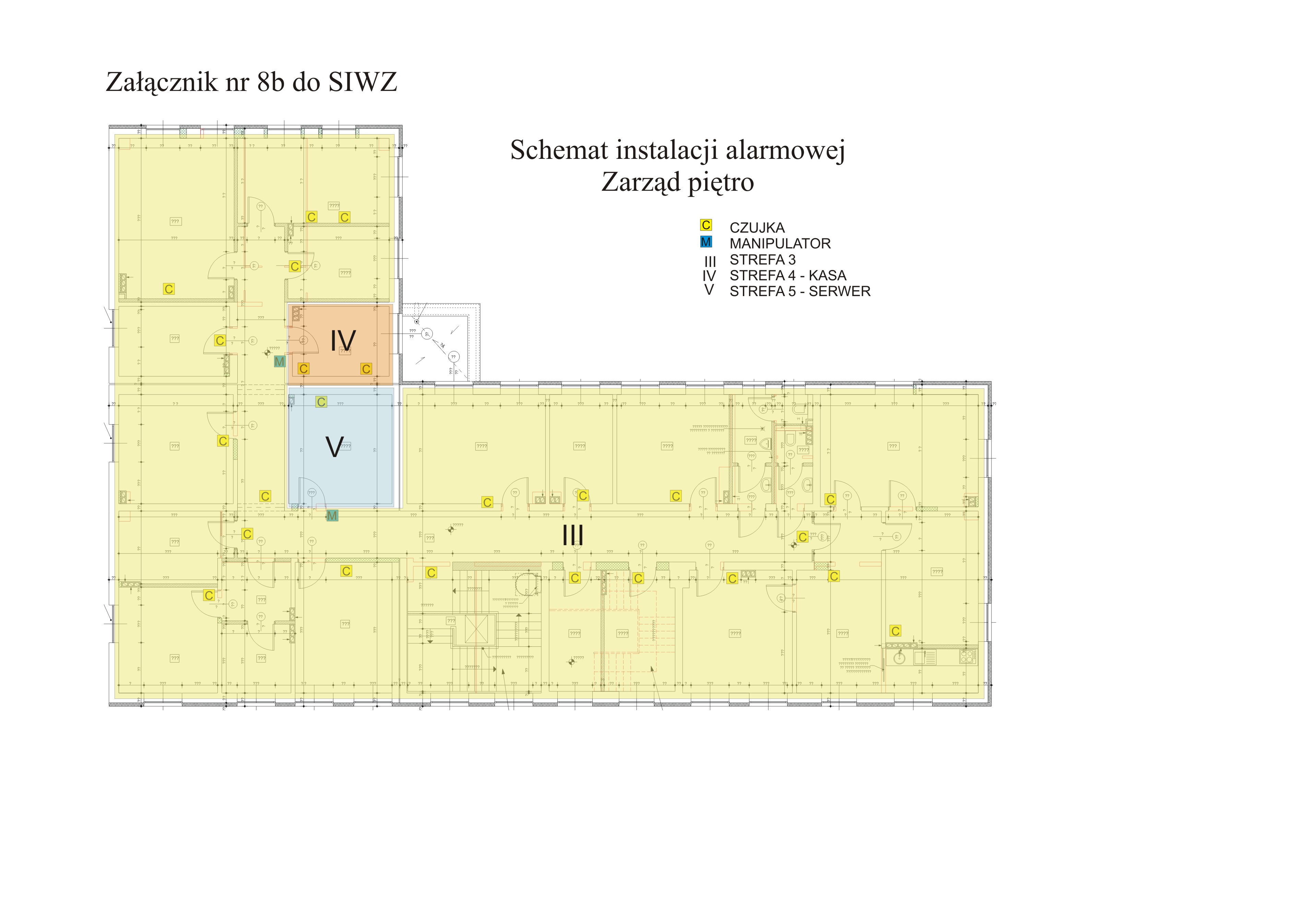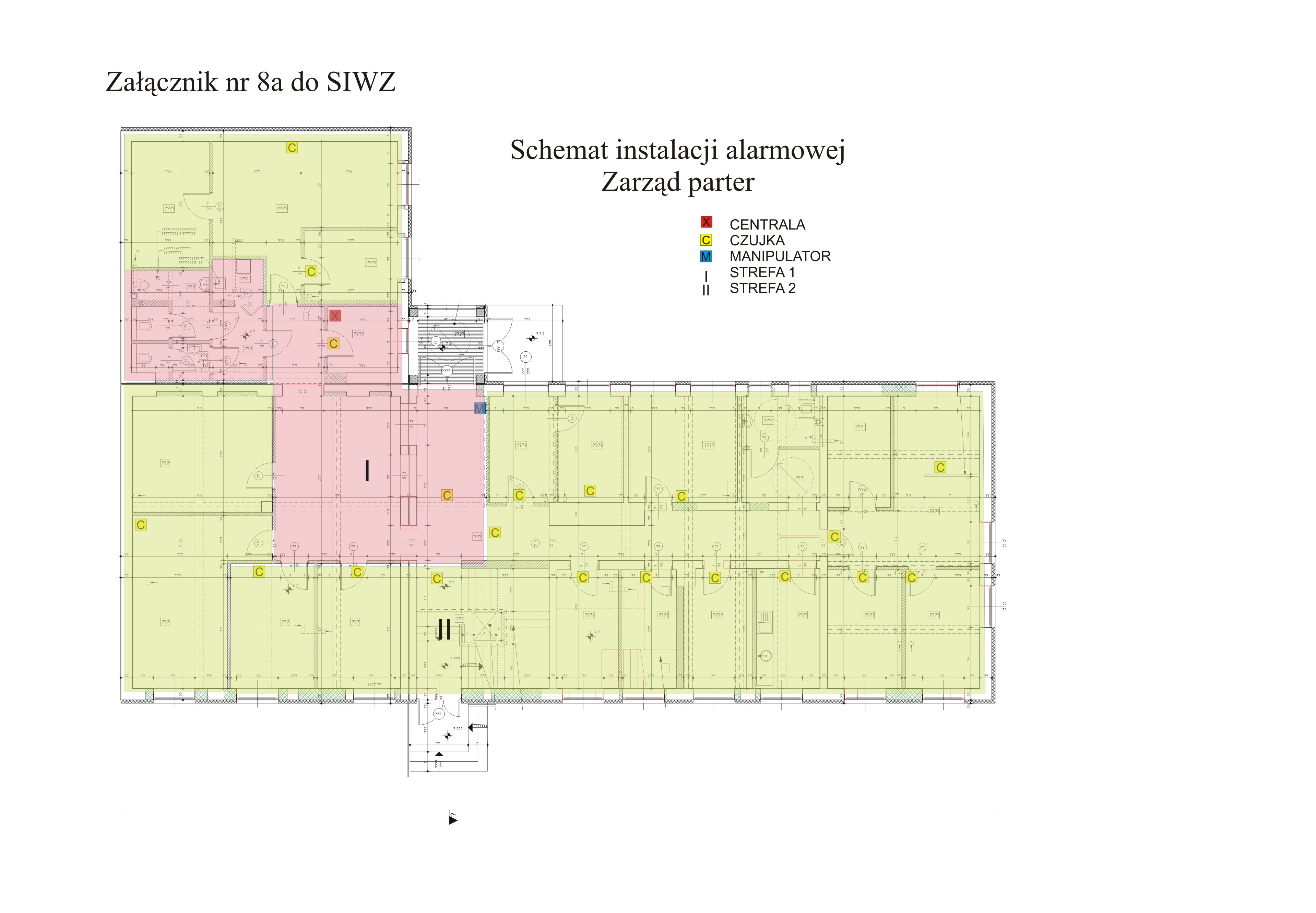 Instalacja systemu alarmowego obejmuje parter i I piętro budynku. Wydzielono 5 stref ochrony z 3 manipulatorami, 1 centralą alarmową i 44 czujkami ruchu. Lokalizację elementów systemu przedstawiono na uproszczonych schematach, które stanowią Załącznik Nr 8a i 8b do SIWZ. Obecnie Zamawiający eksploatuje systemy alarmowe oparte na technologii firmy SATEL Sp. z o.o.