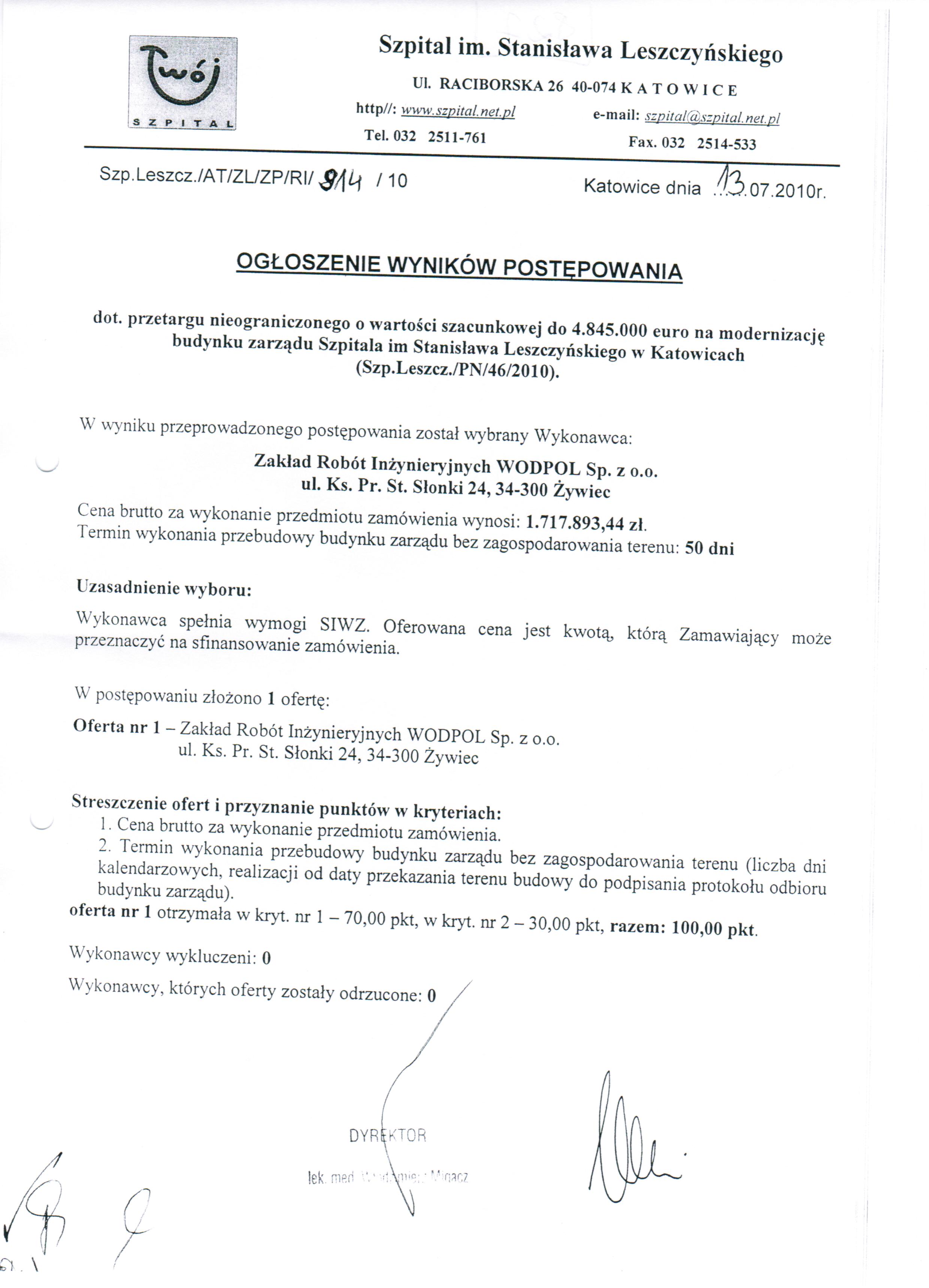 ogłasza przetarg nieograniczony o wartości szacunkowej do 4.845.000 euro na modernizację budynku zarządu Szpitala im Stanisława Leszczyńskiego w Katowicach