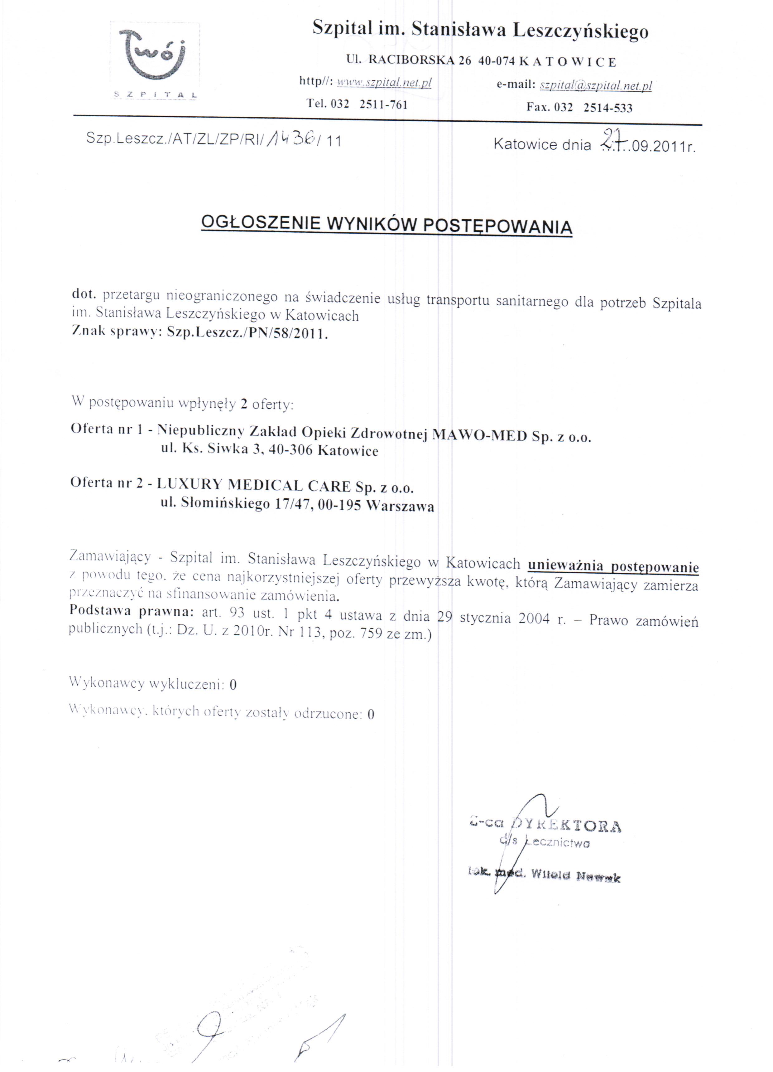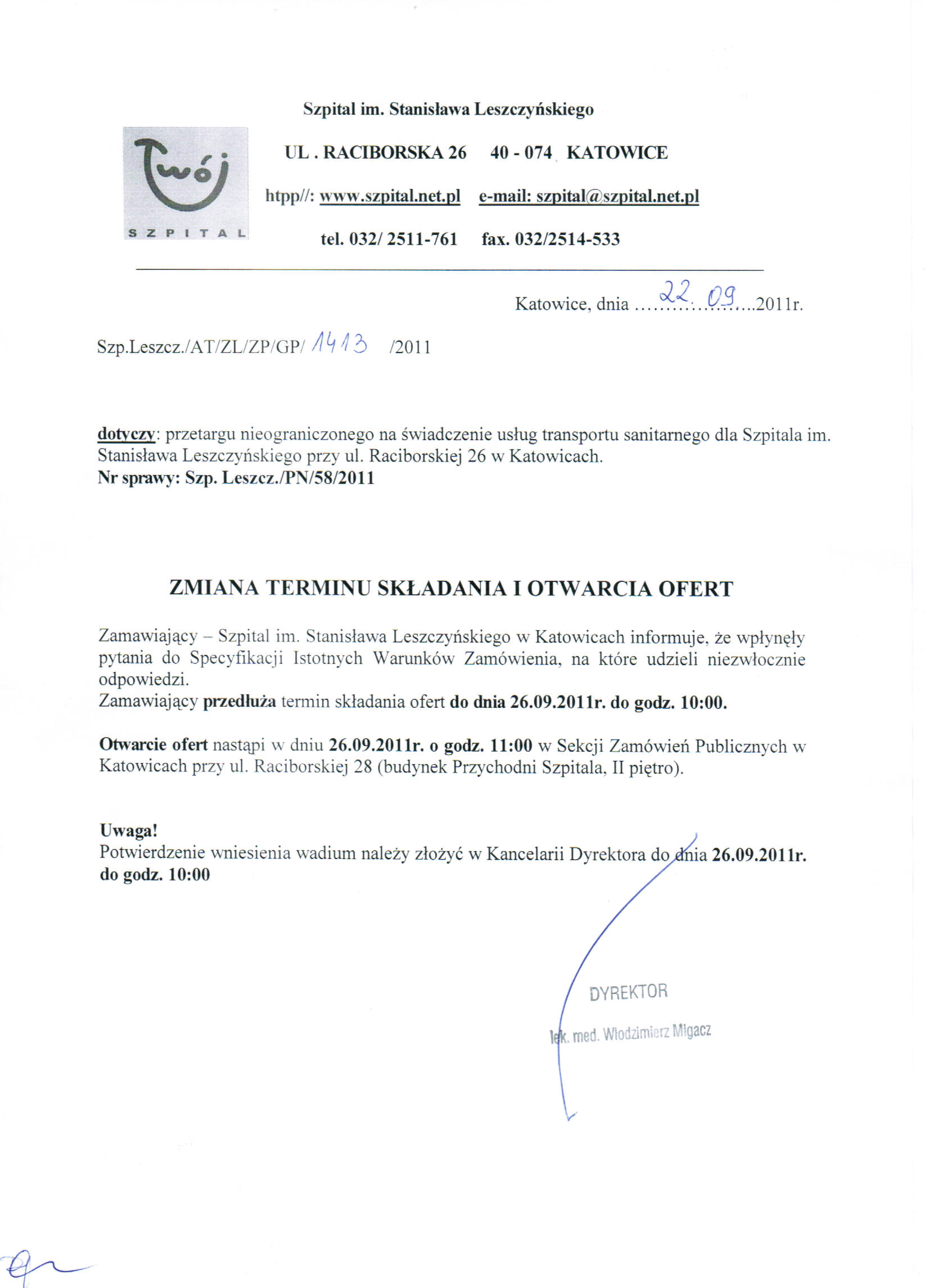 do dnia 23.09.2011r. do godz. 10:00 w Kancelarii Dyrektora Szpitala w Katowicach przy ul. Raciborskiej 26 (I piętro).