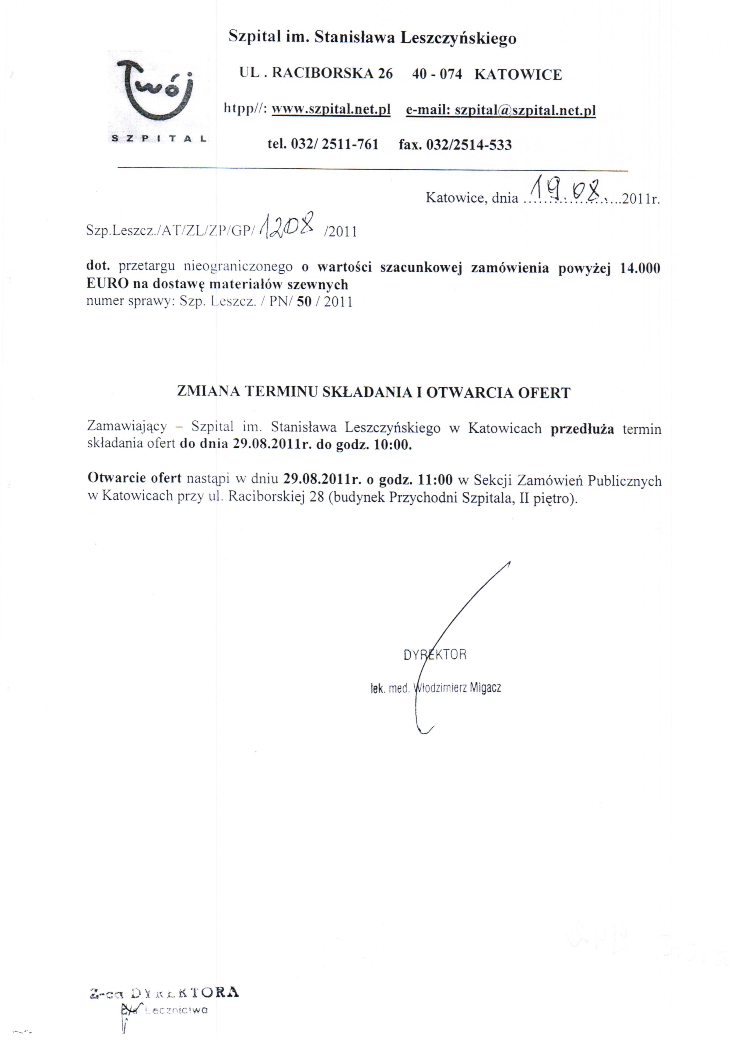 do dnia 24.08.2011r. do godz. 10:00 w Kancelarii Dyrektora Szpitala w Katowicach przy ul. Raciborskiej 26 (I piętro).