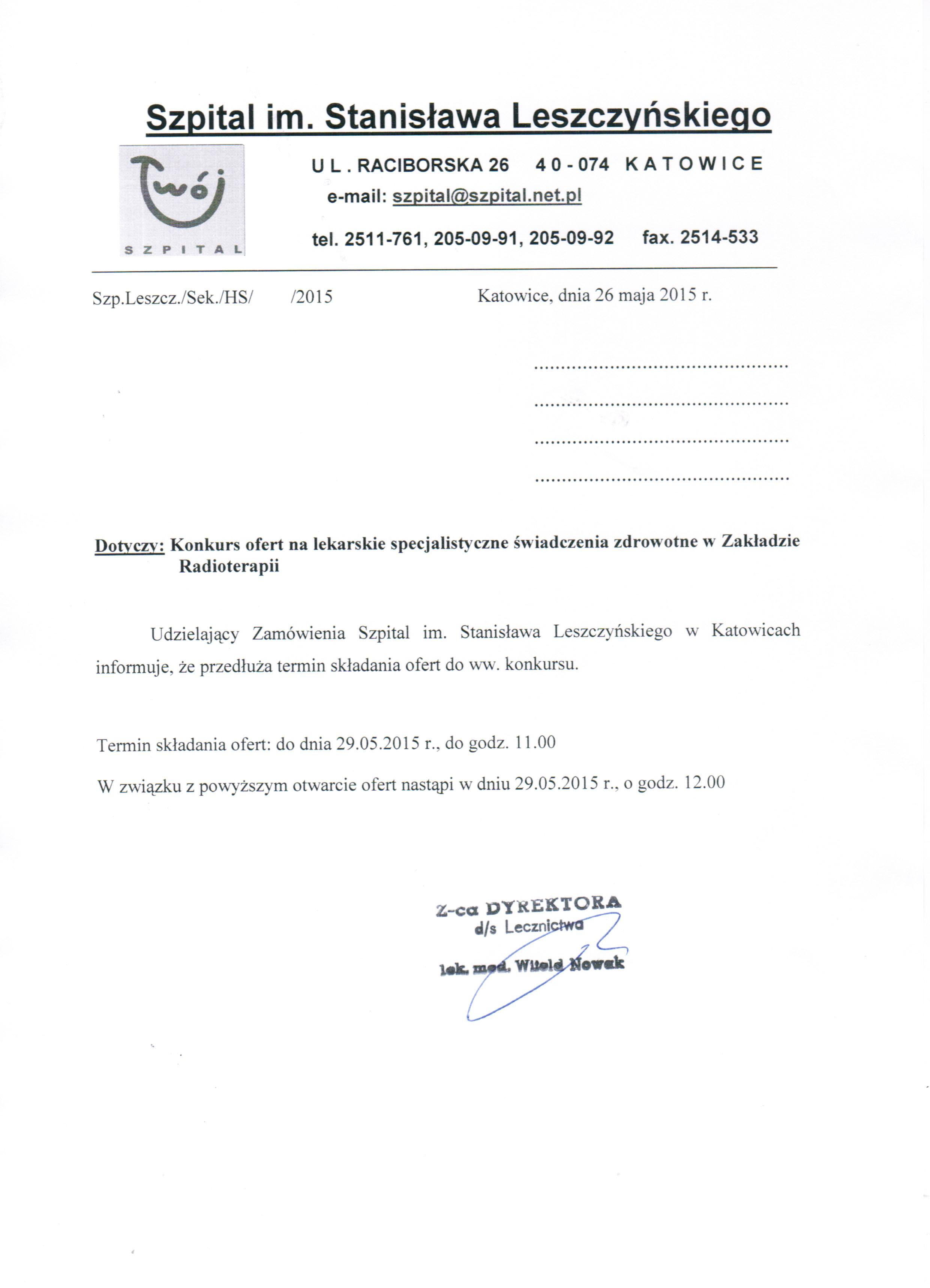 - Oferty należy składać w Kancelarii Szpitala im. Stanisława Leszczyńskiego w Katowicach ul. Raciborska 26 do dnia 26.05.2015 r. do godz. 09.30