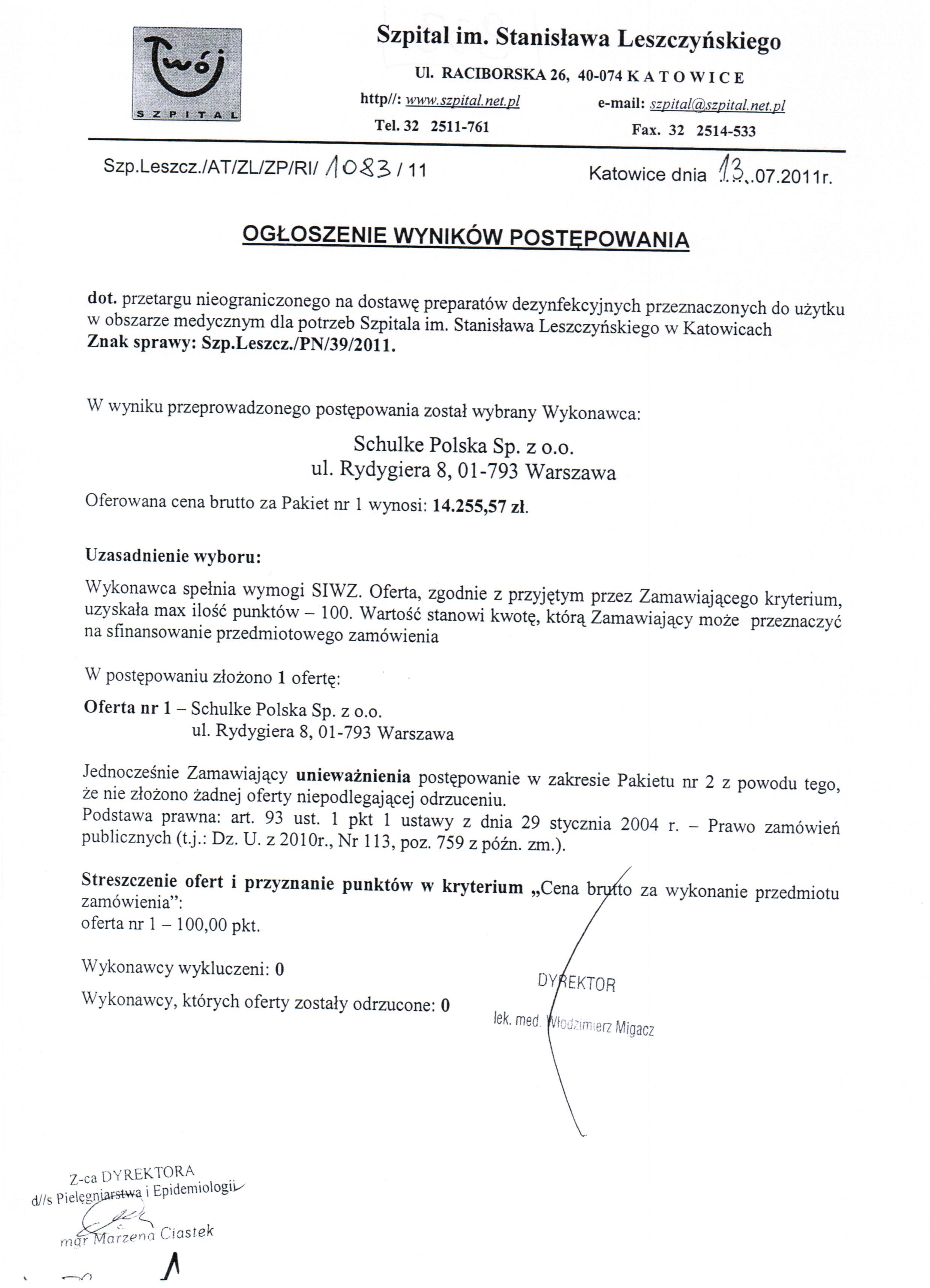 w dniu 28.06.2011r. o godz. 13:00 w Szpitalu im. Stanisława Leszczyńskiego w Katowicach ul. Raciborska 28, budynek Przychodni, II piętro, Sekcja Zamówień Publicznych.