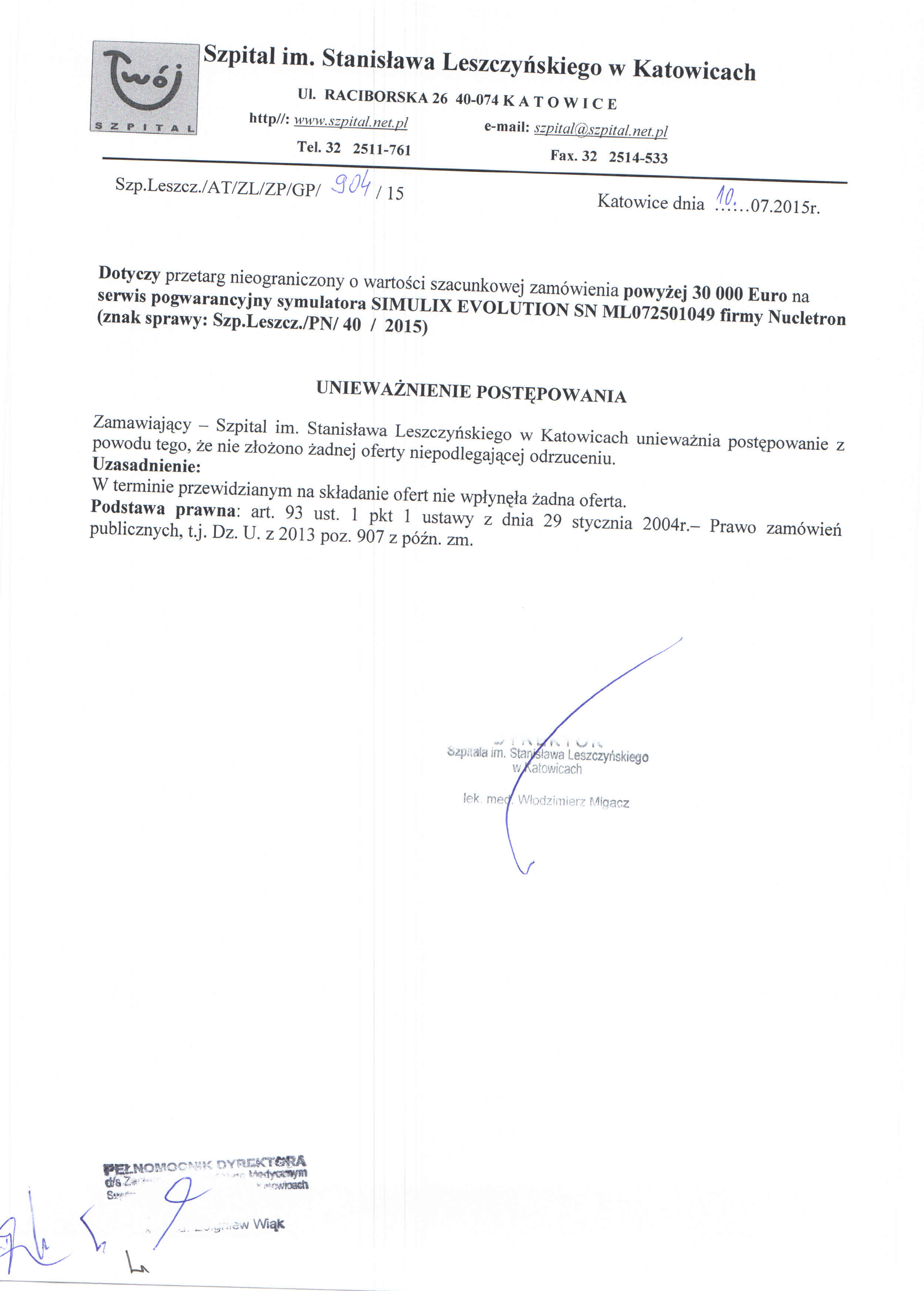 Oferty należy złożyć do dnia 08.07.2015r. do godz. 10:00 w Szpitalu im. Stanisława Leszczyńskiego w Katowicach ul. Raciborska 26 – Kancelaria Dyrektora, I piętro.