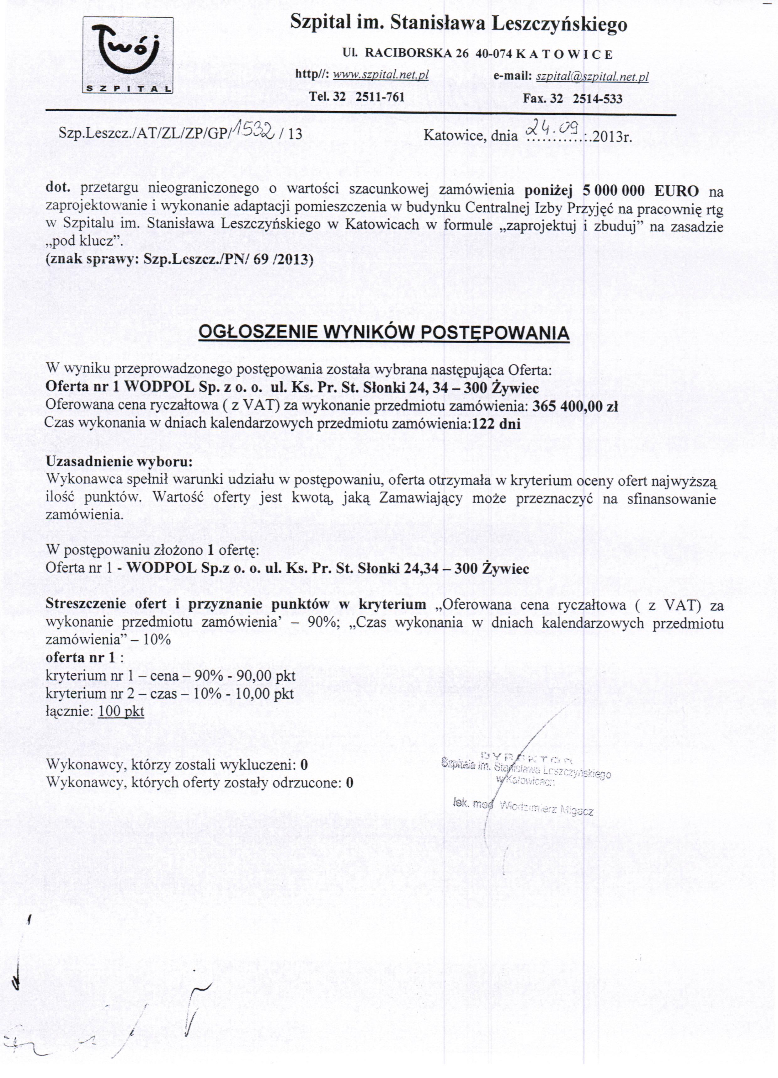 w dniu 16.09.2013r. o godz. 11:00 w Szpitalu im. Stanisława Leszczyńskiego w Katowicach ul. Raciborska 28, budynek Przychodni, II piętro, Sekcja Zamówień Publicznych.