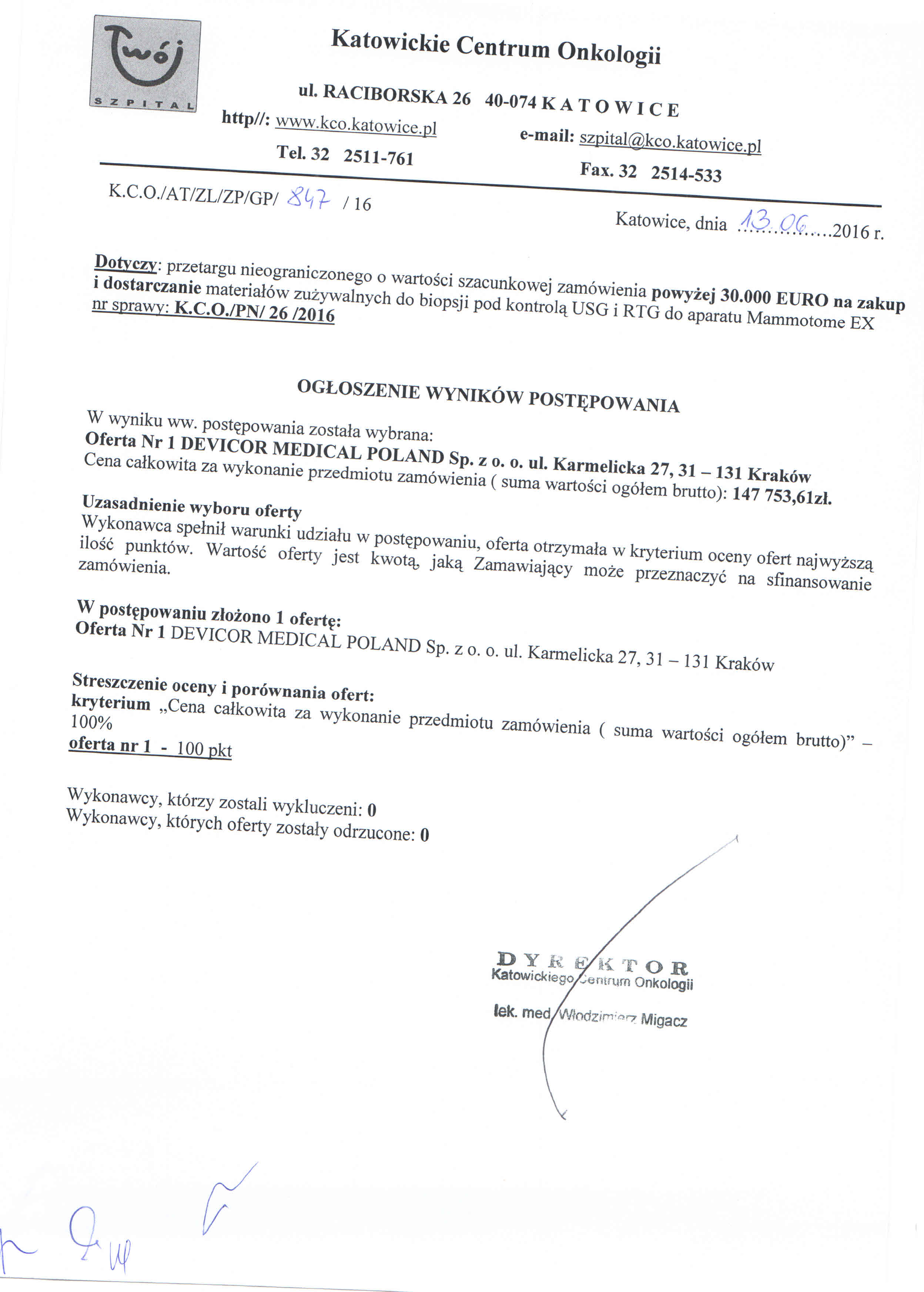 do dnia 16.05.2016r. do godz. 10:00 w Kancelarii Dyrektora Katowickiego Centrum Onkologii w Katowicach przy ul. Raciborskiej 26 (I piętro).