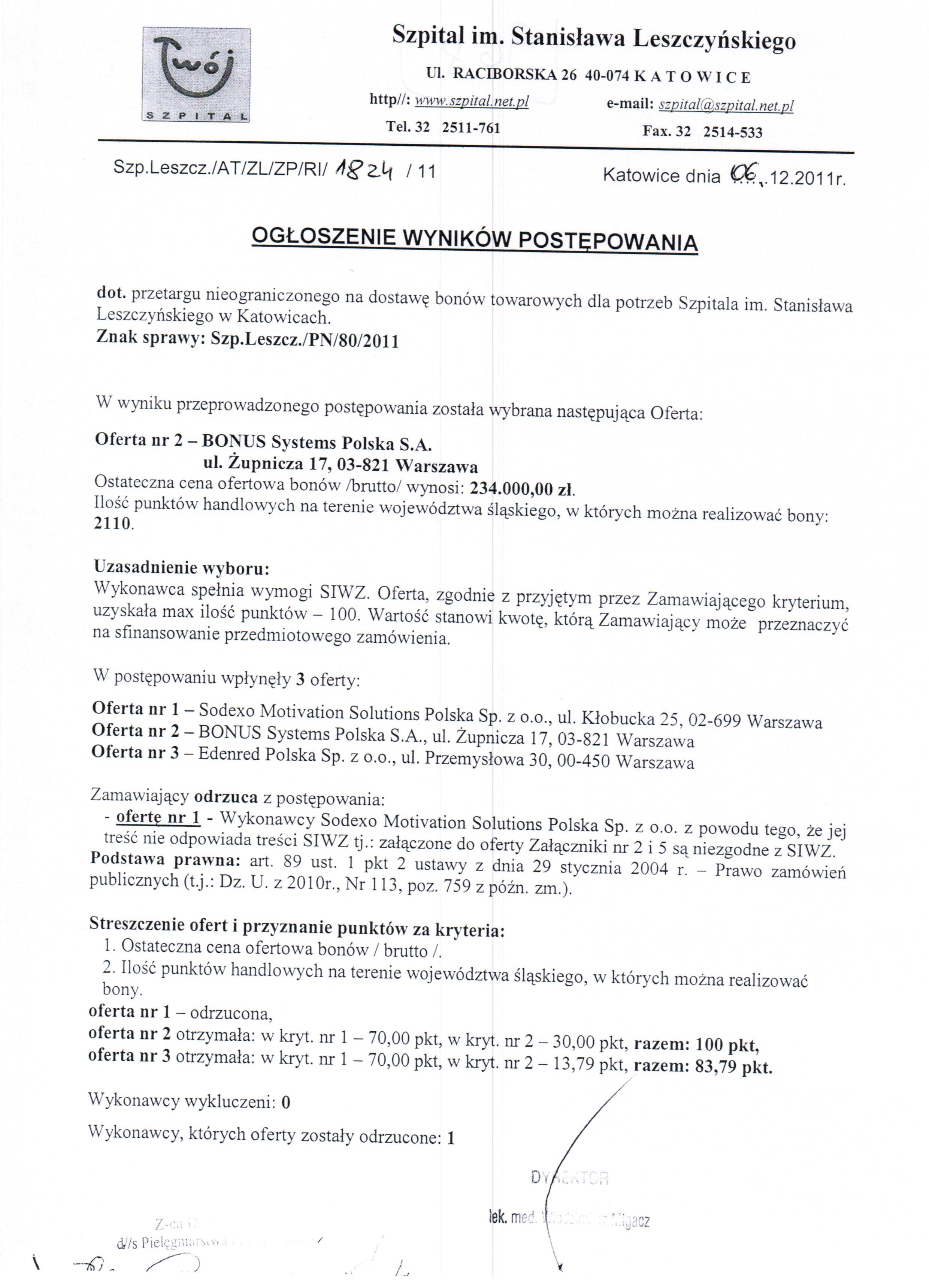 Oferty należy złożyć do dnia 24.11.2011r. do godz. 10:00 w Szpitalu im. Stanisława Leszczyńskiego w Katowicach ul. Raciborska 26 – Kancelaria Dyrektora.
