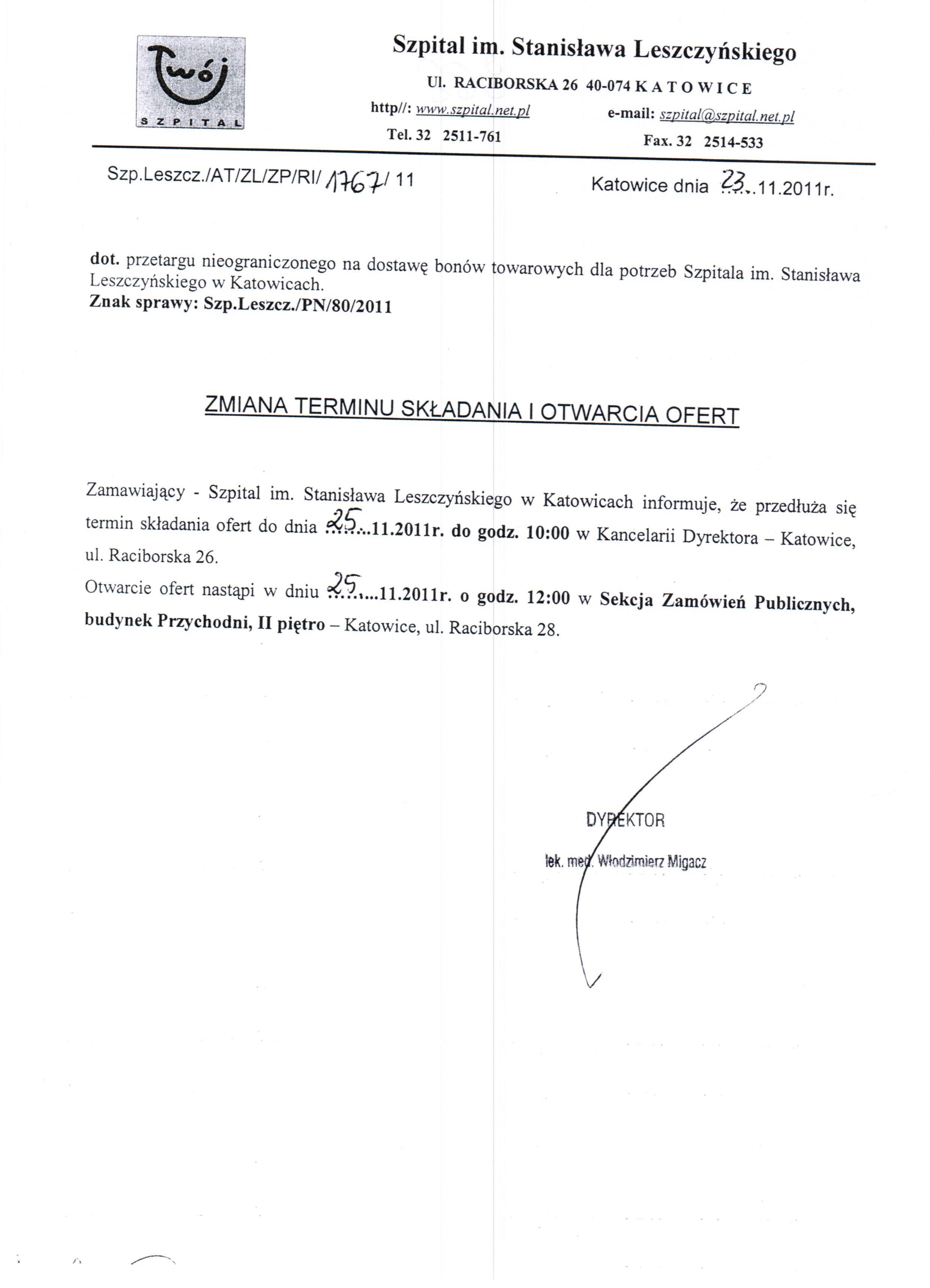 Otwarcie ofert nastąpi w dniu 24.11.2011r. o godz. 11:00 w Szpitalu im. Stanisława Leszczyńskiego w Katowicach ul. Raciborska 28, budynek Przychodni, II piętro, Sekcja Zamówień Publicznych.