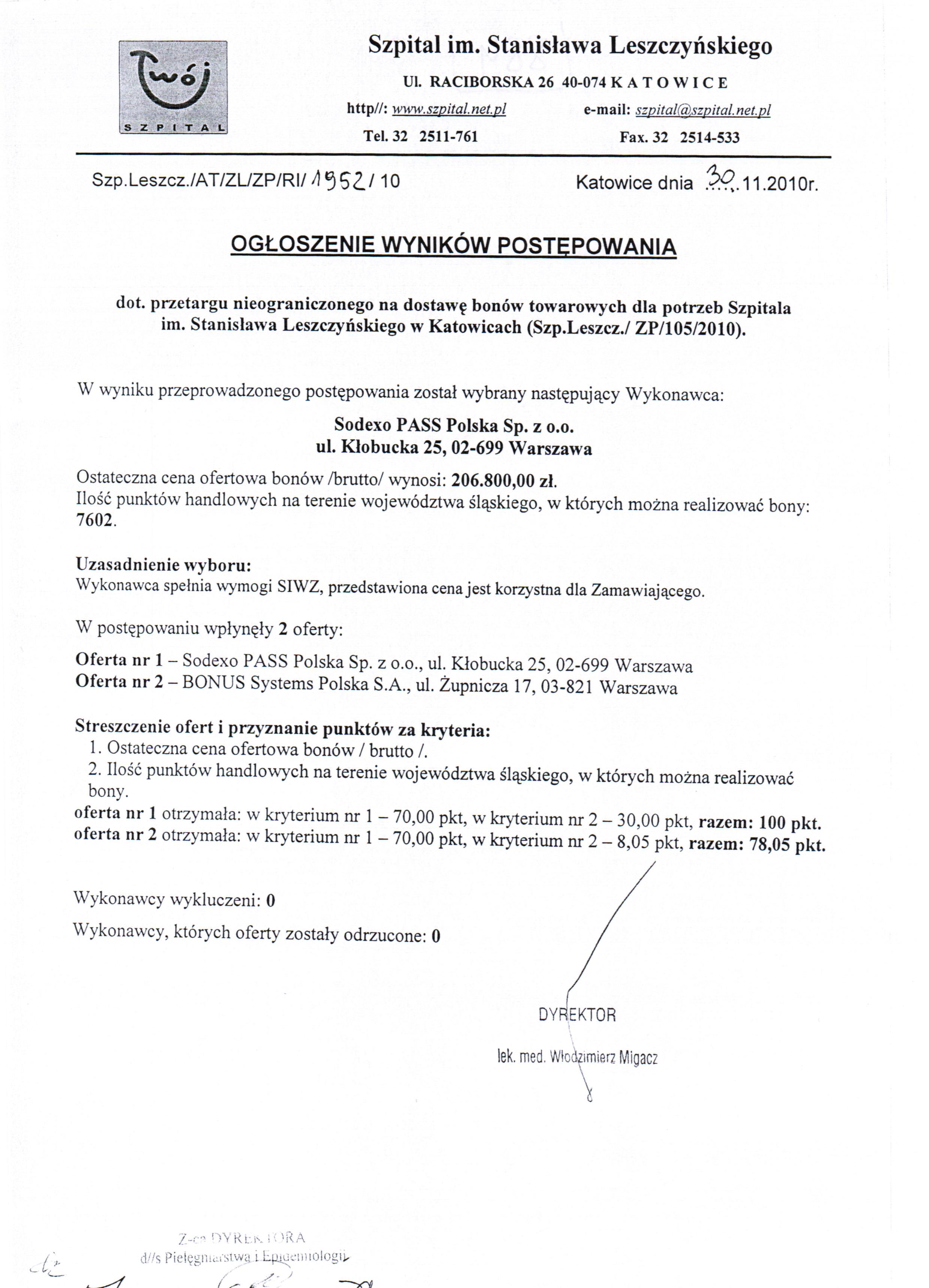Ogłoszenie wyników postępowania (30.11.2010)