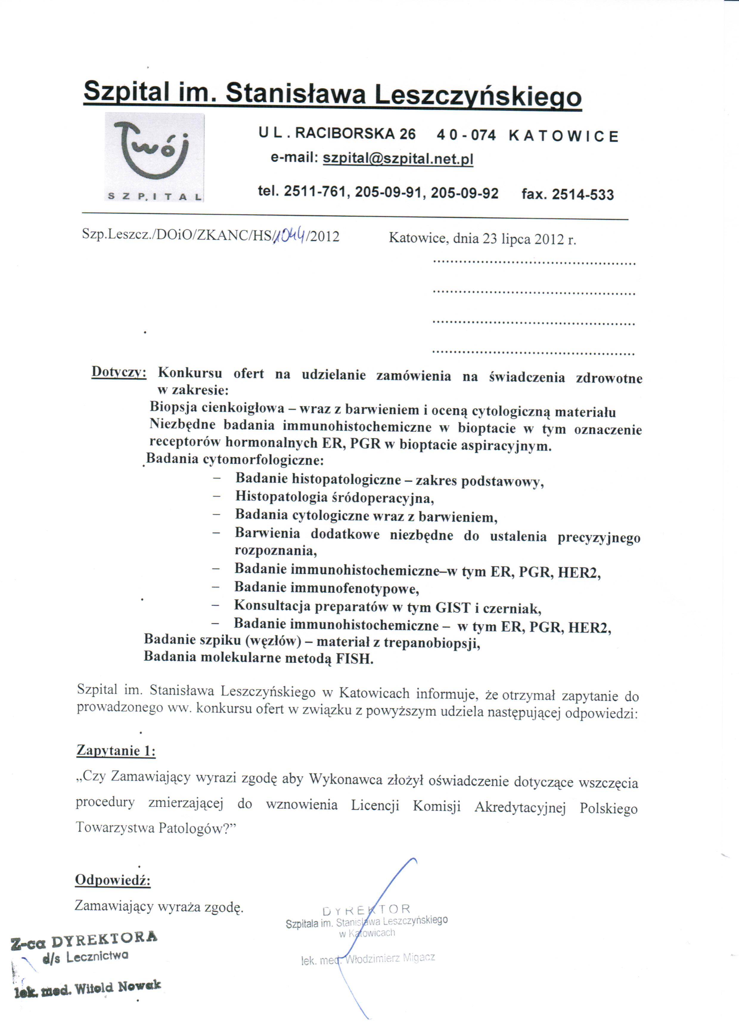 Dodatkowych informacji udziela Z-ca Dyrektora ds. Lecznictwa lek. med. Witold Nowak pod nr tel. (32) 251 17 61.