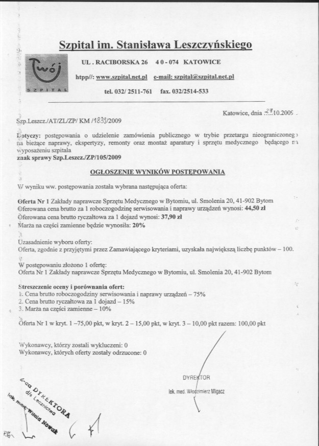 Oferty należy złożyć do dnia 23.10.2009r. do godz. 11:00 w Kancelarii Dyrektora Szpitala im. Stanisława Leszczyńskiego w Katowicach przy ul. Raciborskiej 26.