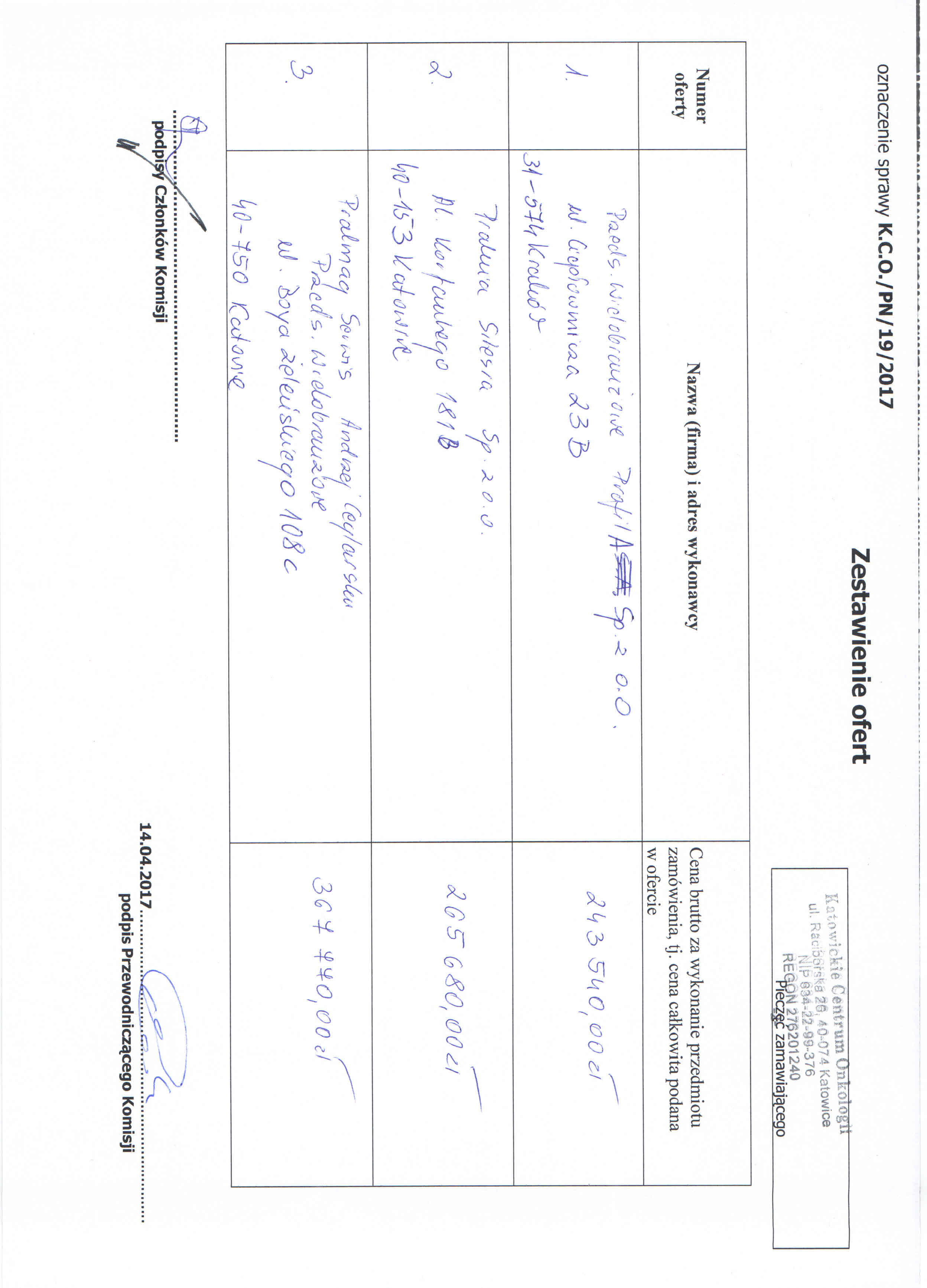 w dniu 14.04.2017r. o godz. 11:00, w 40-074 Katowice, ul. Raciborska 28 (budynek Przychodni, II piętro, Sekcja Zamówień Publicznych)