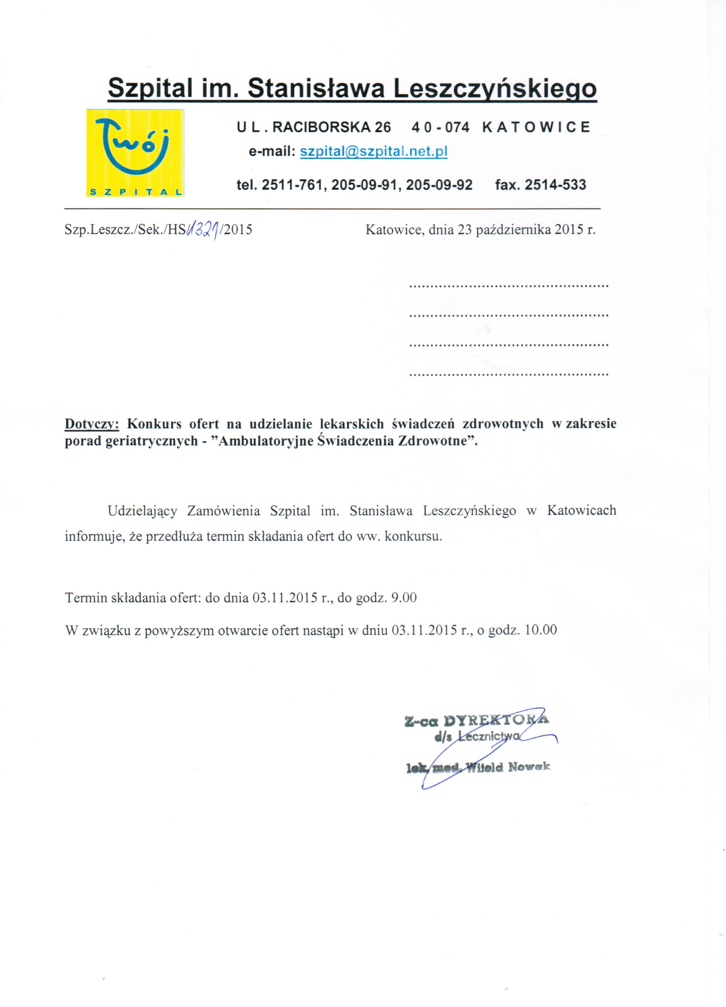 - Oferty należy składać w Kancelarii Szpitala im. Stanisława Leszczyńskiego w Katowicach ul. Raciborska 26 do dnia 26.10.2015 r. do godz. 09.00