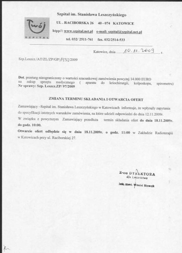 do dnia 13.11.2009r. do godz. 10.00 w Kancelarii Dyrektora Szpitala, w Katowicach, przy ul. Raciborskiej 26
