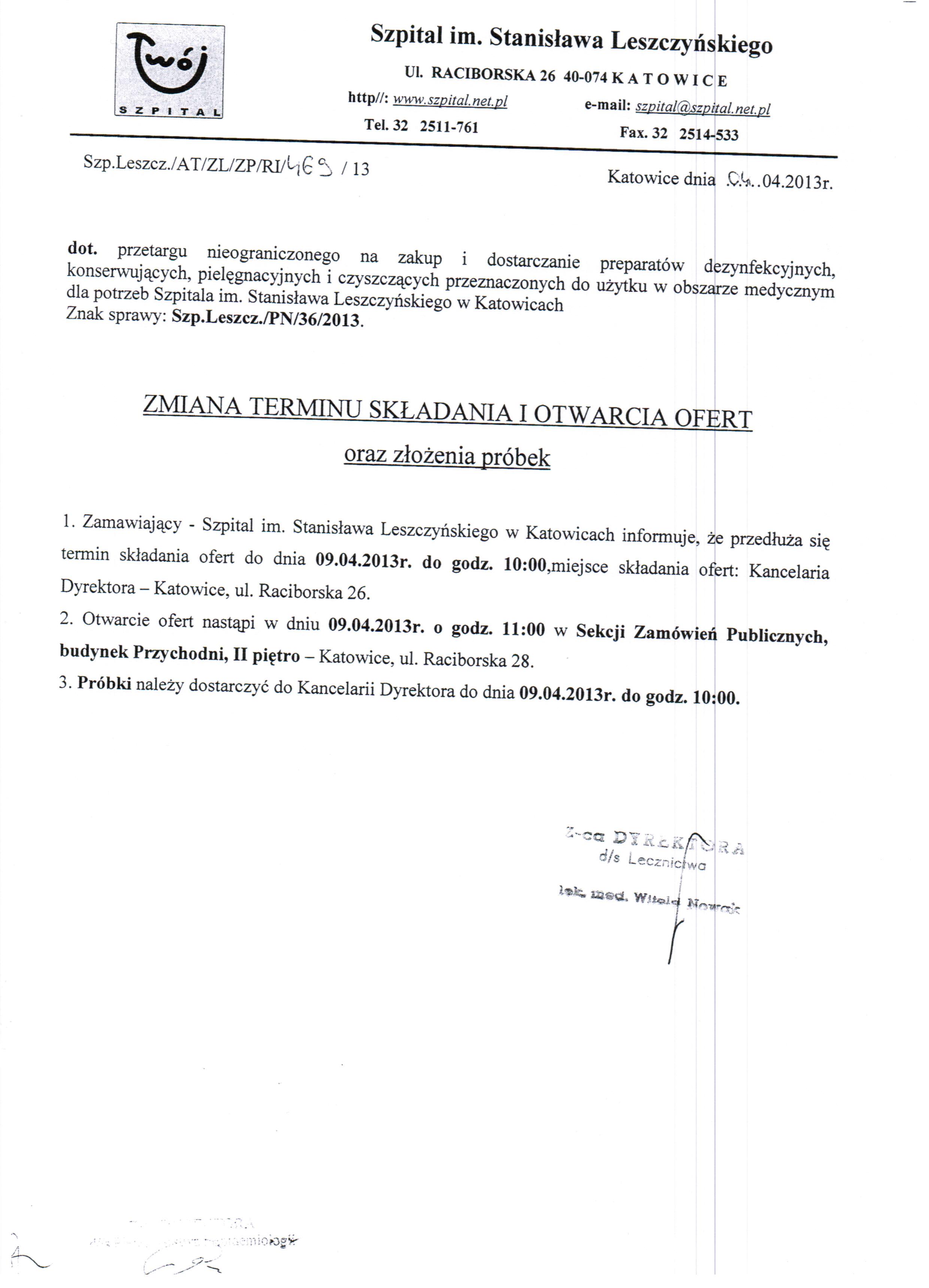 do dnia 05.04.2013 r. do godz. 10:00 w Szpitalu im. Stanisława Leszczyńskiego w Katowicach ul. Raciborska 26 – Kancelaria Dyrektora.