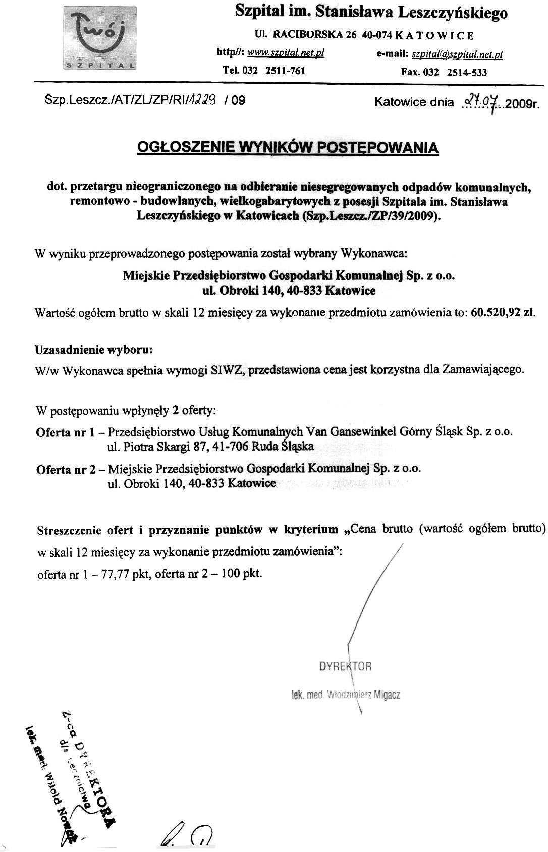 do dnia 18.06.2009r. do godz. 11:00 w Kancelarii Dyrektora Szpitala w Katowicach, przy ul. Raciborskiej 26.