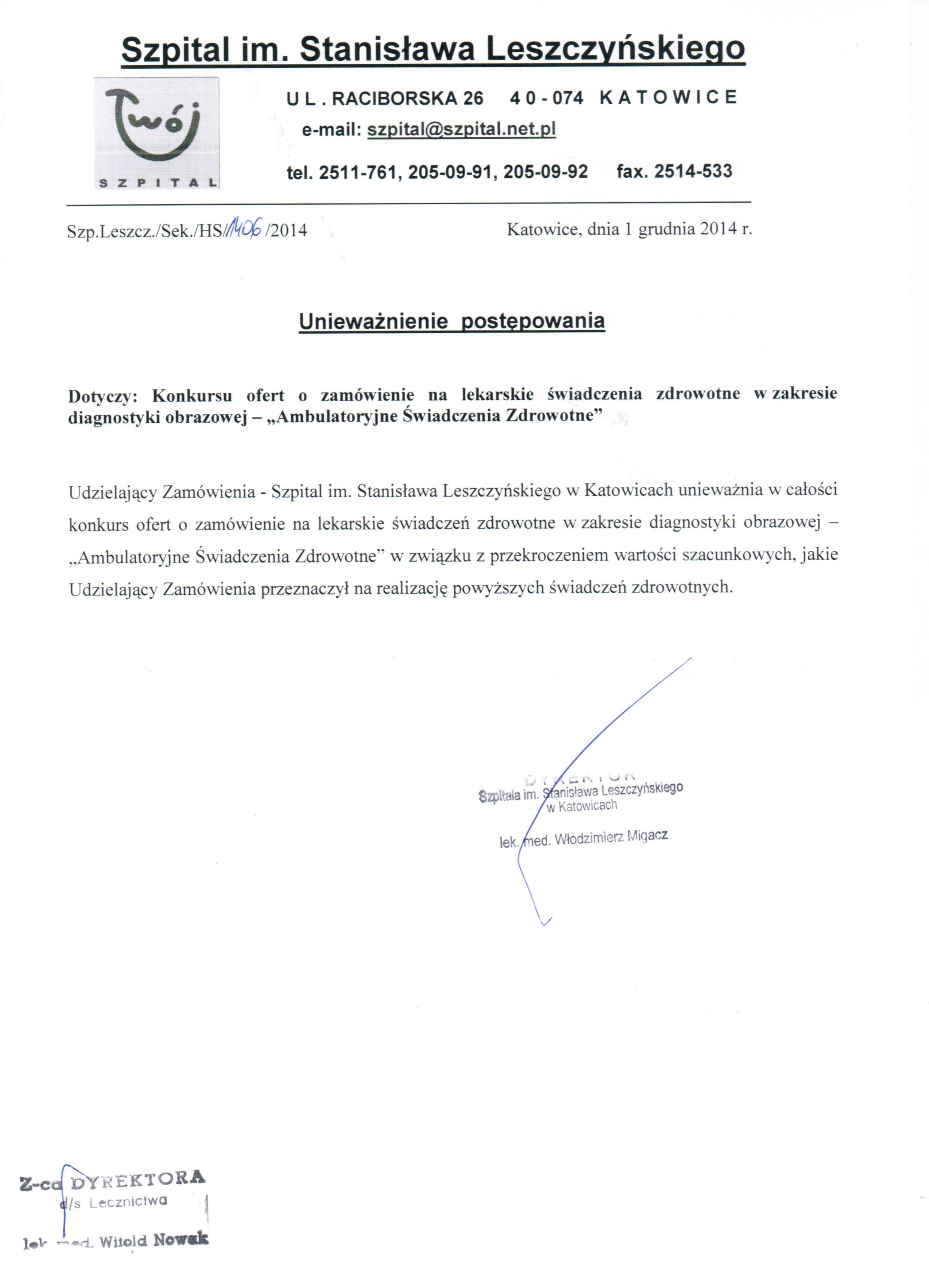 Dodatkowych informacji udziela Z-ca Dyrektora ds. Lecznictwa lek. med. Witold Nowak pod nr tel. (32) 42 00 151-153.