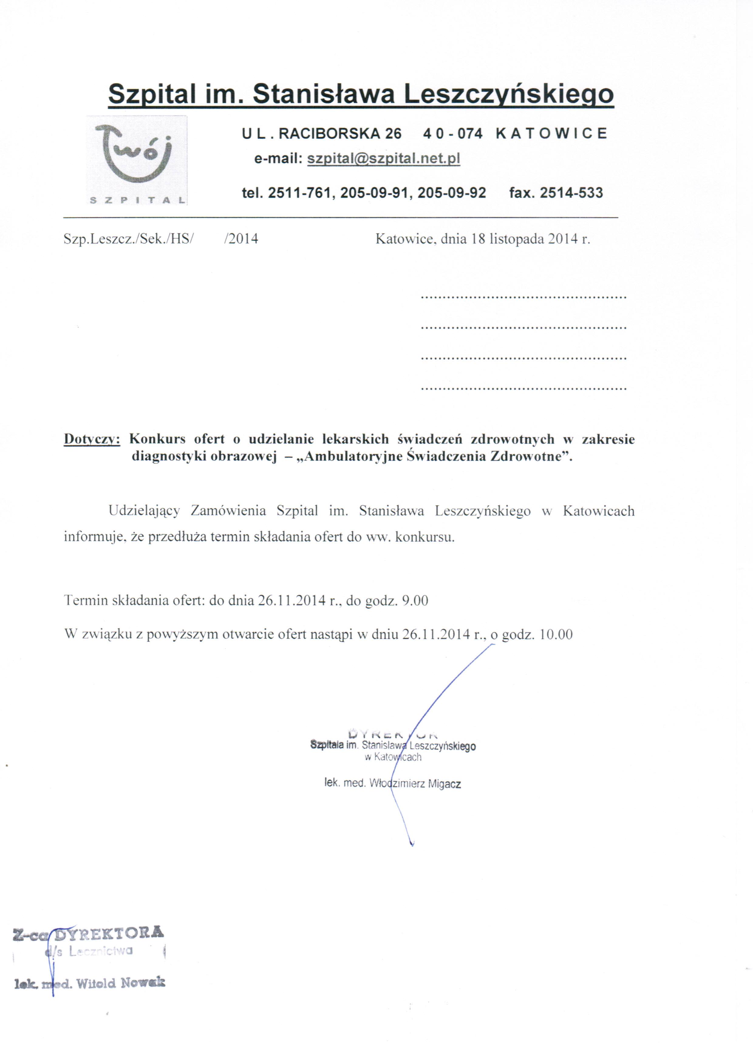 - Otwarcie ofert nastąpi w budynku Dyrekcji Szpitala im. Stanisława Leszczyńskiego, Raciborska 26, I piętro, Sala Konferencyjna w dniu 12.11.2014 r. o godz. 10.00