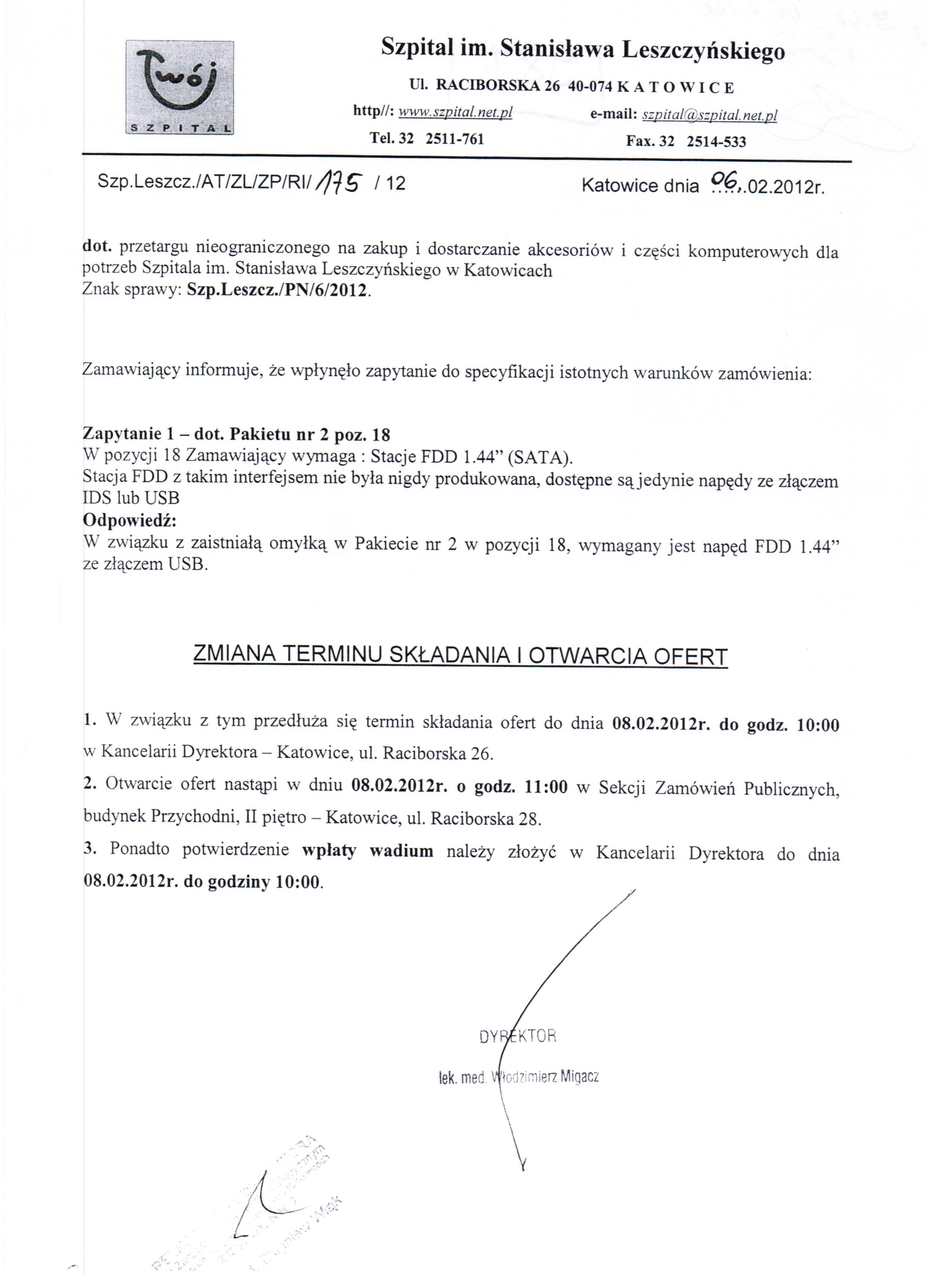do dnia 06.02.2012r. do godz. 10:00 w Szpitalu im. Stanisława Leszczyńskiego w Katowicach ul. Raciborska 26 – Kancelaria Dyrektora.