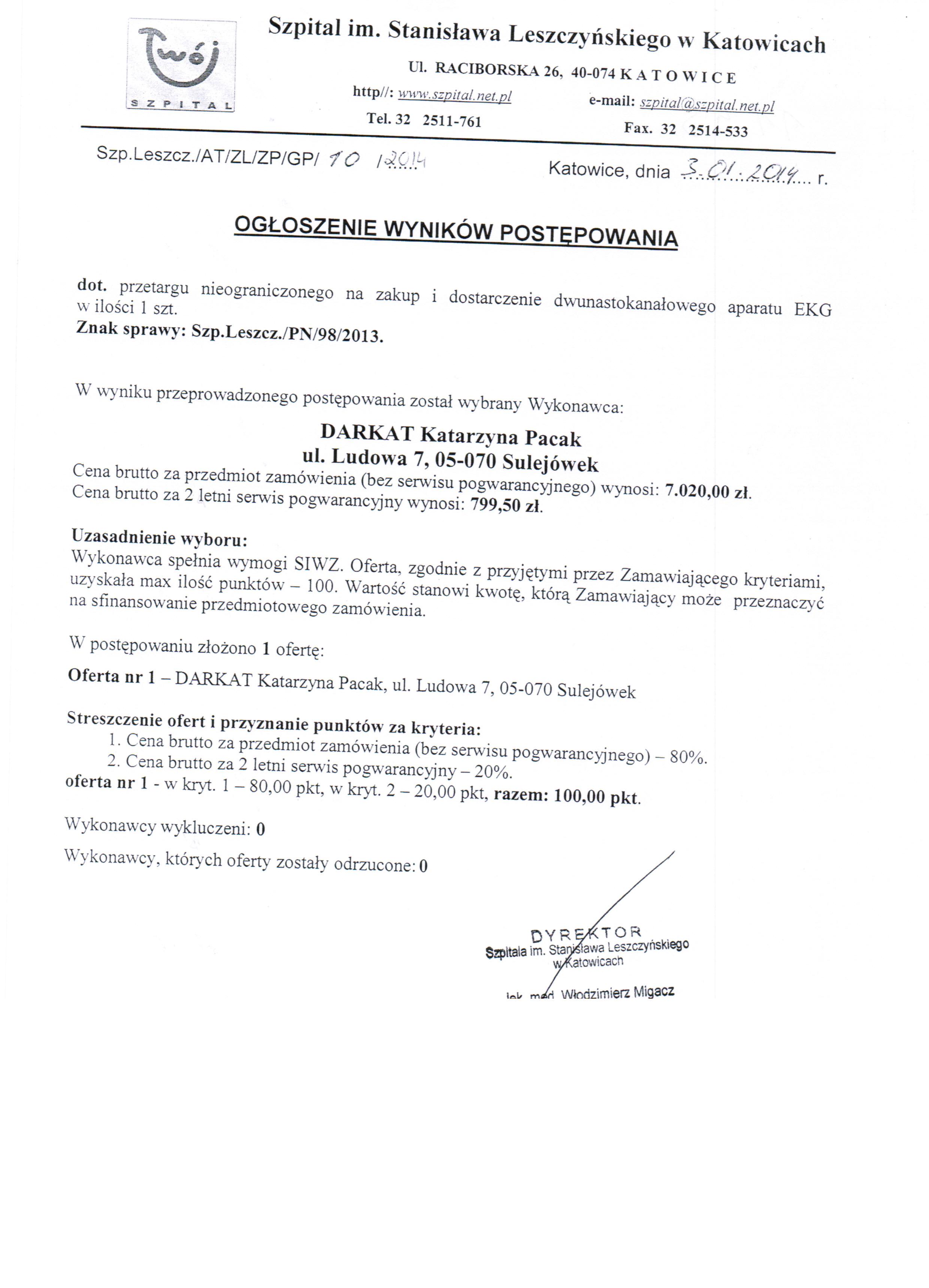 ogłasza przetarg nieograniczony o wartości szacunkowej zamówienia poniżej 14.000 EURO na zakup i dostarczenie dwunastokanałowego aparatu EKG