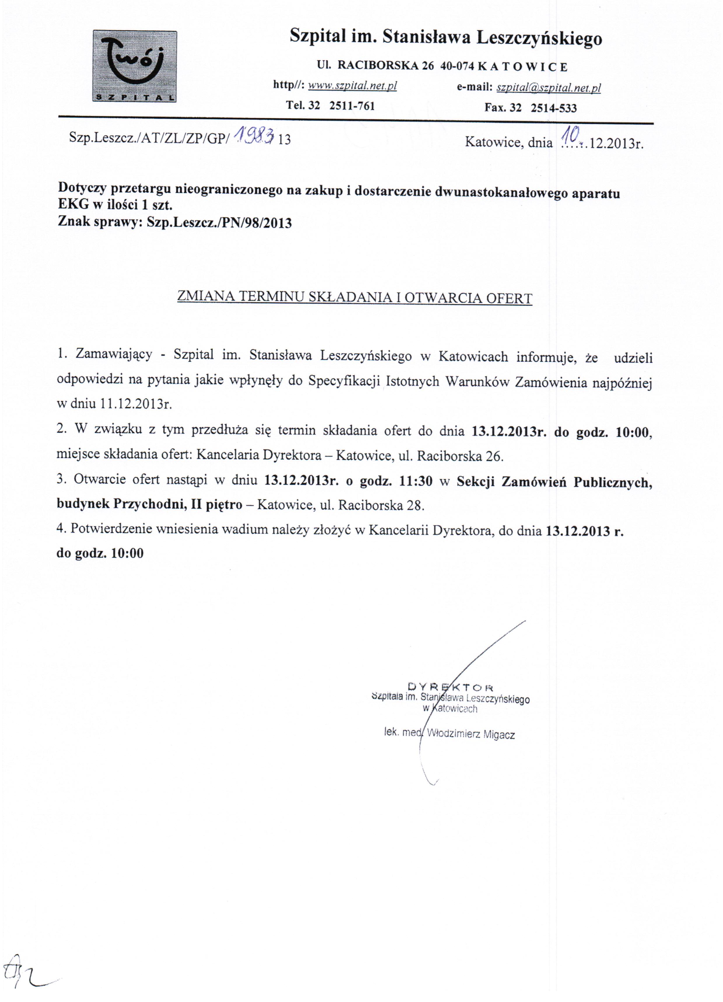 w dniu 11.12.2013r. o godz. 11:00 w 40-074 Katowice, ulica Raciborska 28, budynek Przychodni, II piętro, Sekcja Zamówień Publicznych.