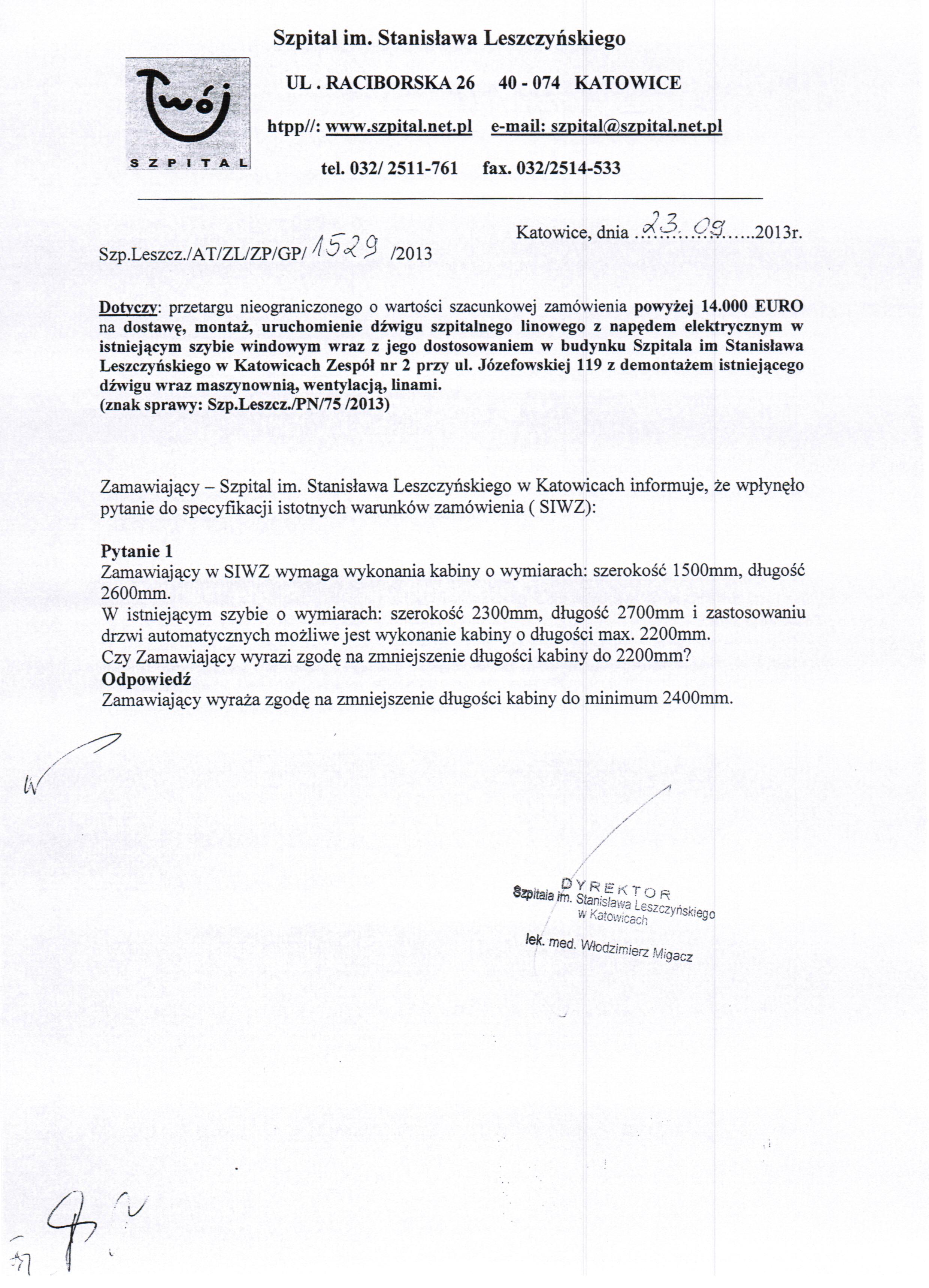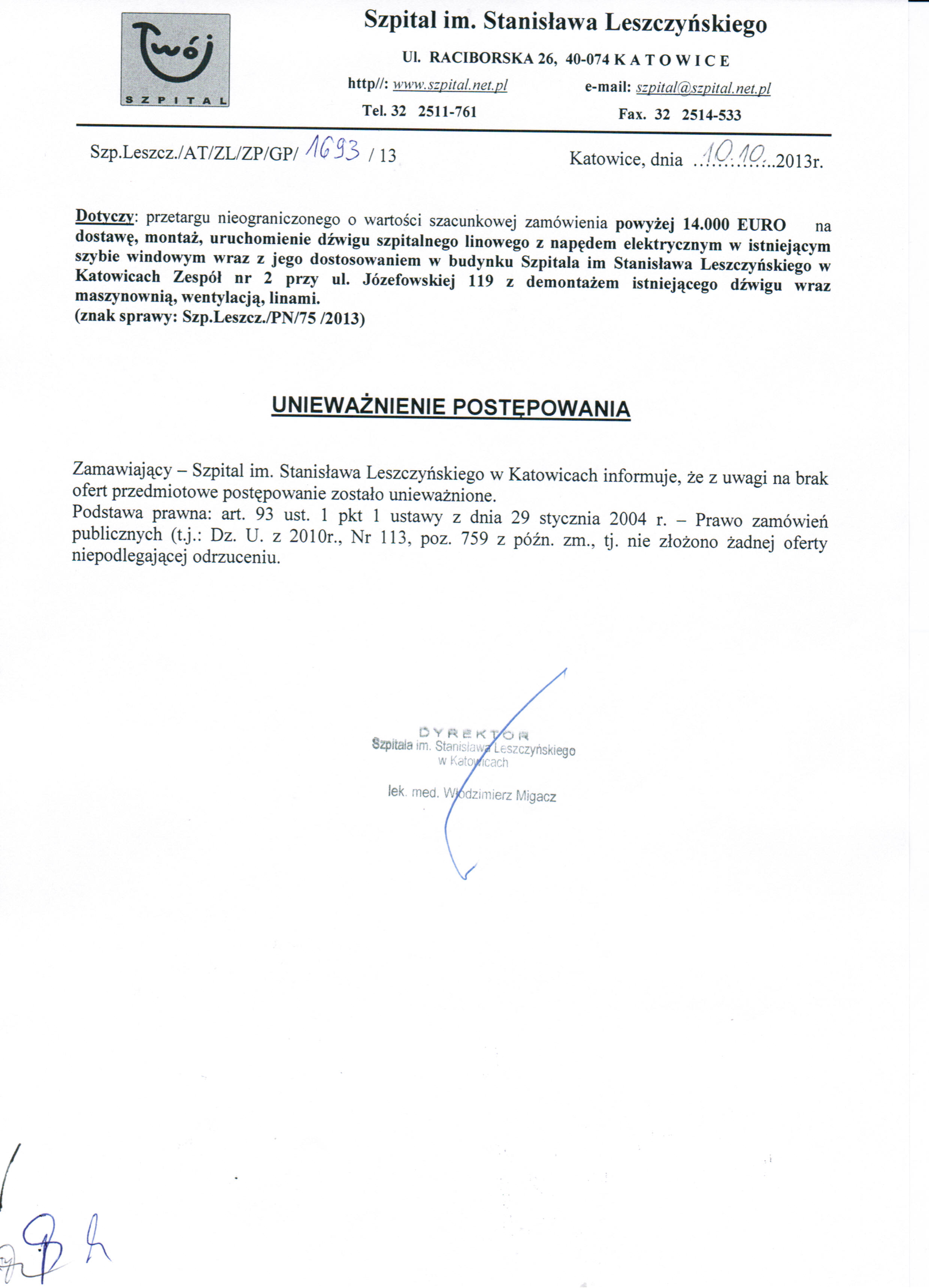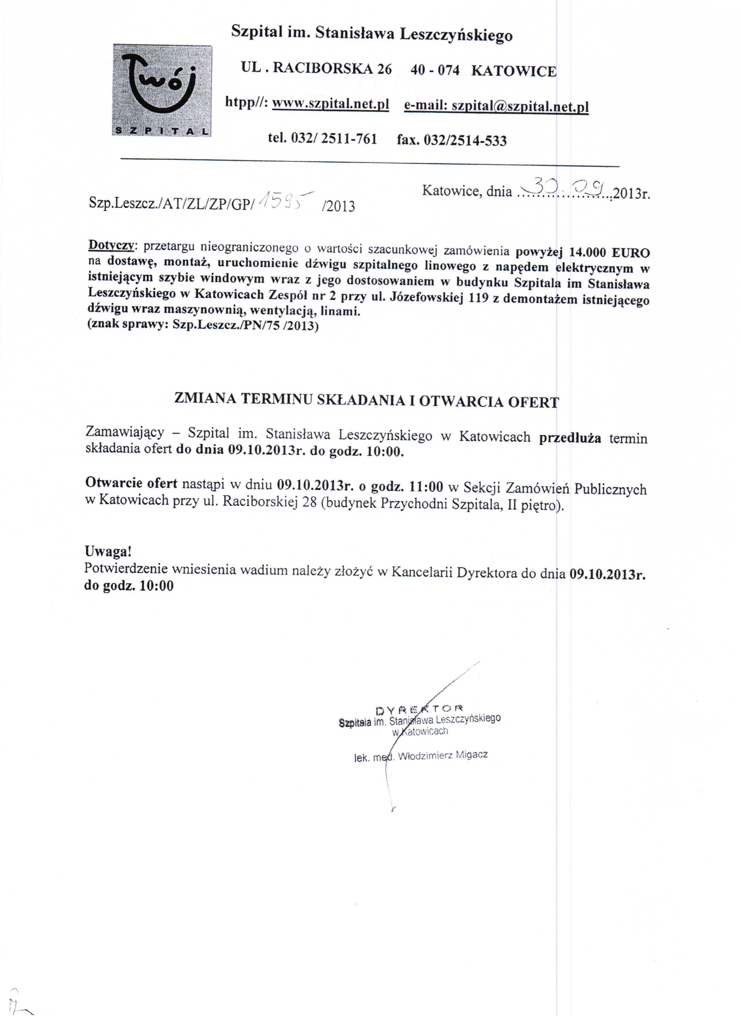 Oferty należy złożyć do dnia 30.09.2013 r. do godz. 10:00 w Szpitalu im. Stanisława Leszczyńskiego w Katowicach ul. Raciborska 26 – Kancelaria Dyrektora.