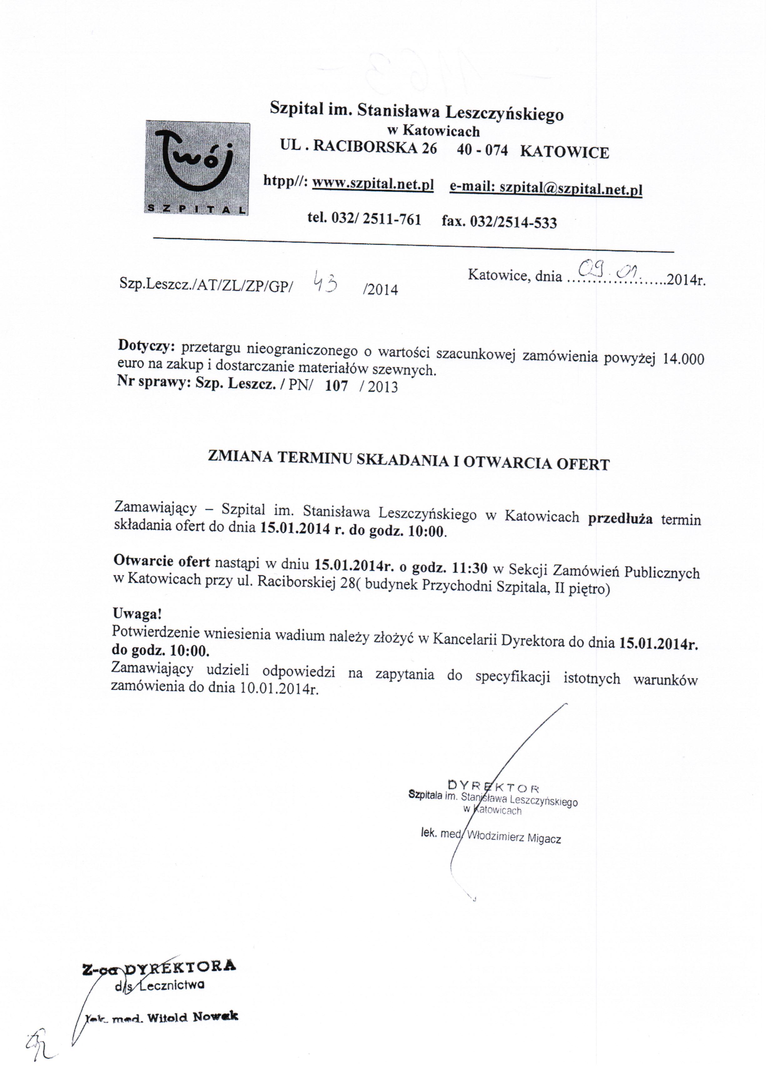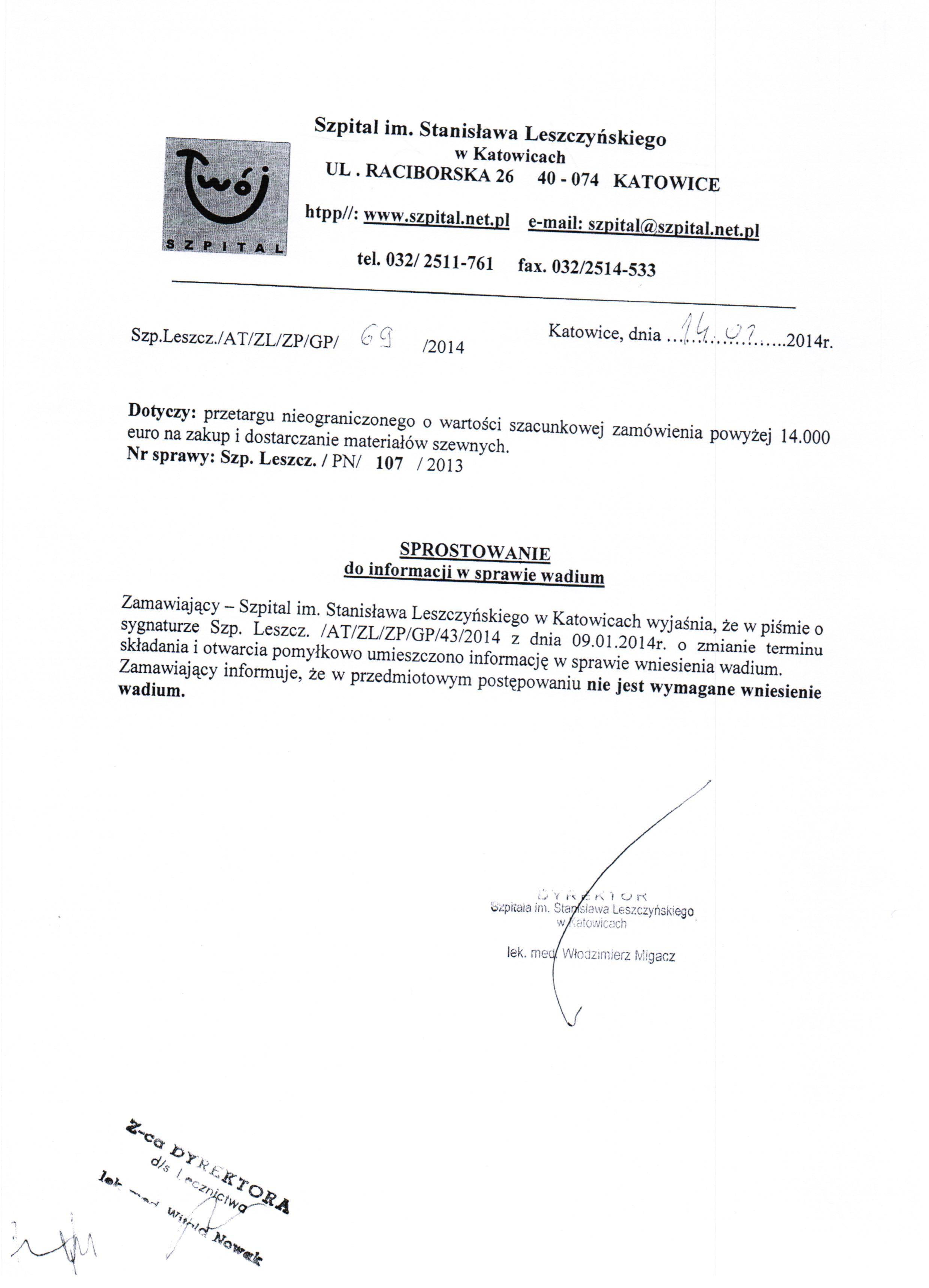 w dniu 10.01.2014r. o godz. 11:30 w Sekcji Zamówień Publicznych w Katowicach przy ul. Raciborskiej 28 (budynek Przychodni Szpitala, II piętro).