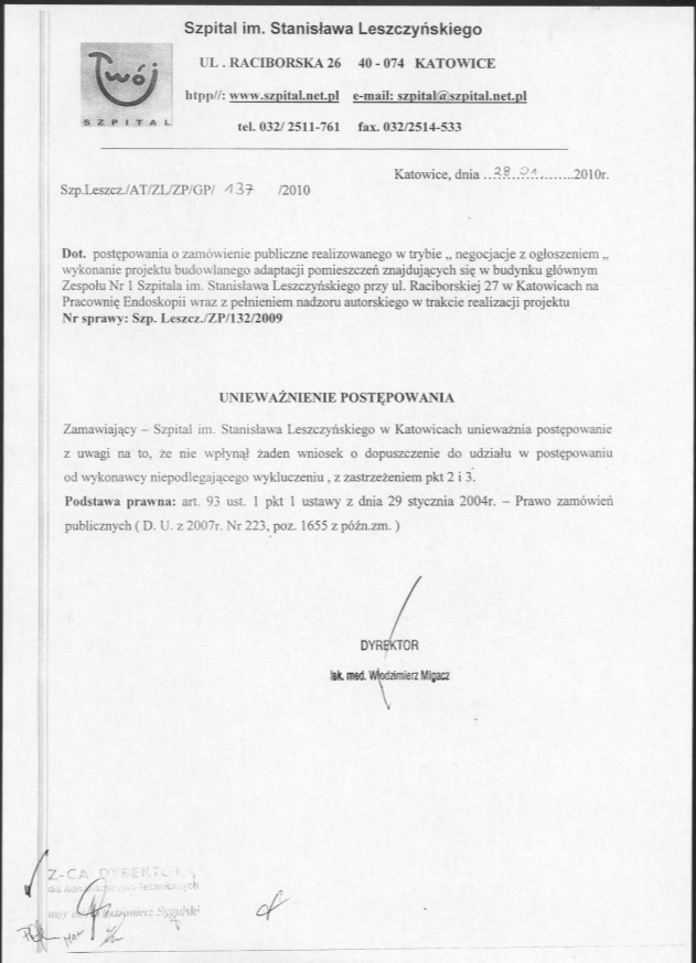 wykonanie projektu budowlanego adaptacji pomieszczeń znajdujących się w budynku głównym Zespołu Nr 1 Szpitala im. Stanisława Leszczyńskiego przy ul. Raciborskiej 27 w Katowicach na Pracownię Endoskopii wraz z pełnieniem nadzoru autorskiego w trakcie realizacji projektu