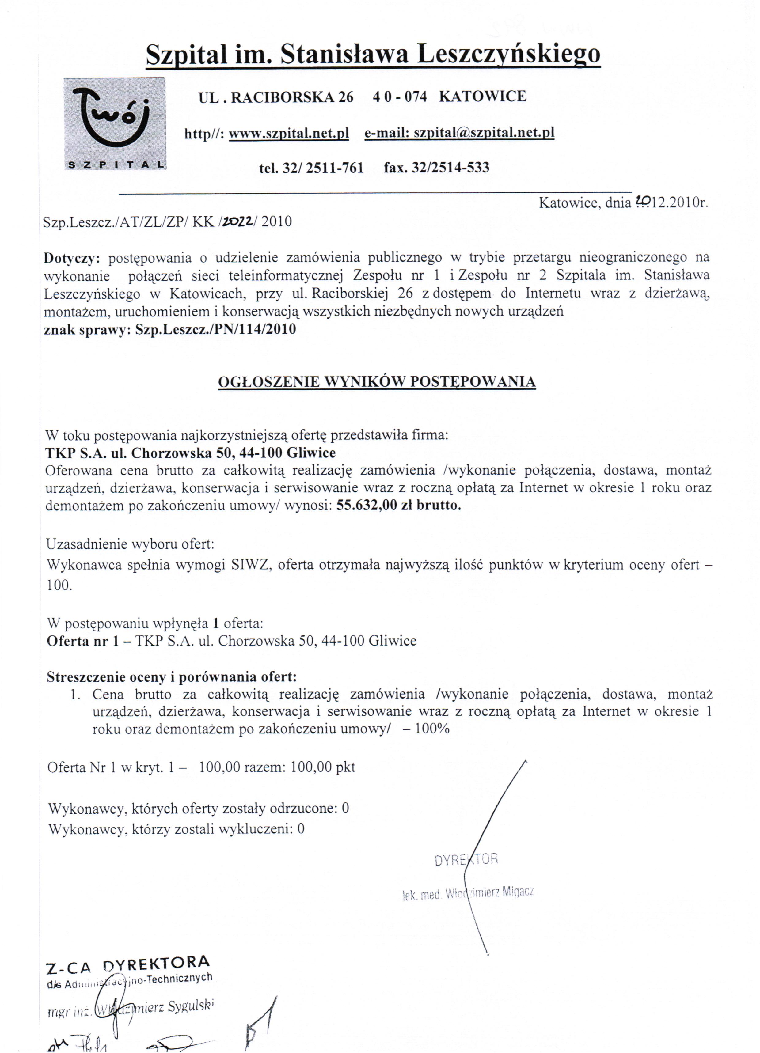 wykonanie połączeń sieci teleinformatycznej Zespołu nr 1 i Zespołu nr 2 Szpitala im. Stanisława Leszczyńskiego w Katowicach, przy ul. Raciborskiej 26 z dostępem do Internetu wraz z dzierżawą, montażem, uruchomieniem i konserwacją wszystkich niezbędnych nowych urządzeń.