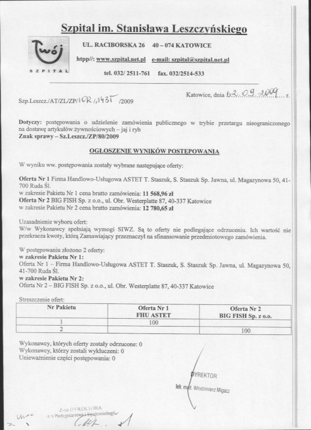 Otwarcie ofert nastąpi w dniu 25.08.2009r. o godz. 11.00 w Sali Konferencyjnej Zakładu Radioterapii w Katowicach przy ul. Raciborskiej 27.