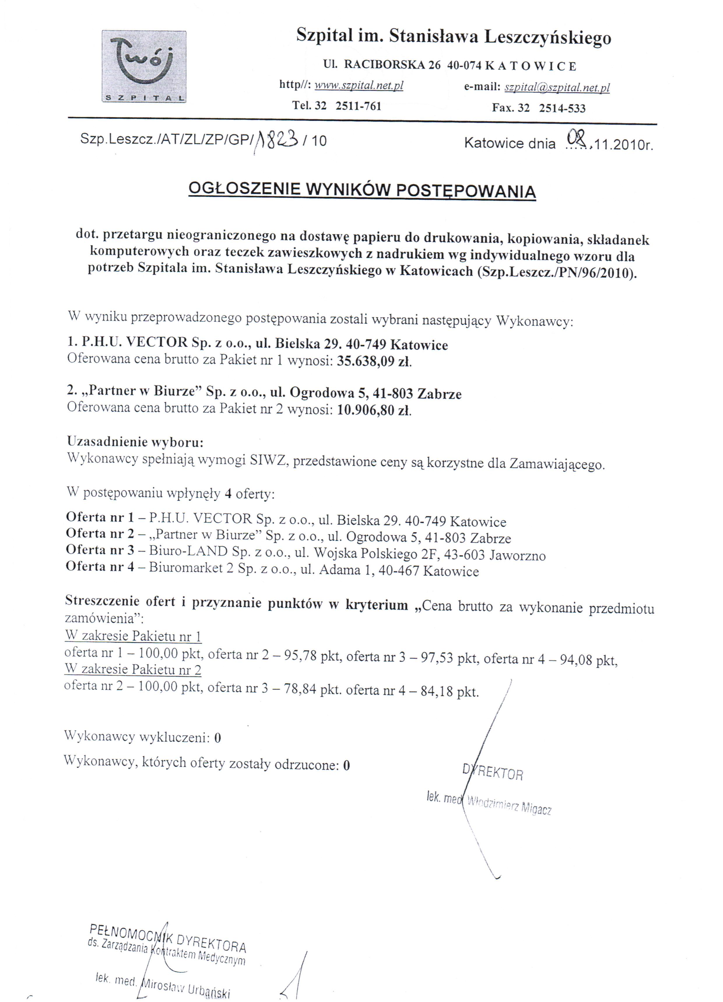 w dniu 21.10.2010r. o godz. 11:00 w Szpitalu im. Stanisława Leszczyńskiego w Katowicach ul. Raciborska 28, budynek Przychodni, II piętro, Sekcja Zamówień Publicznych.