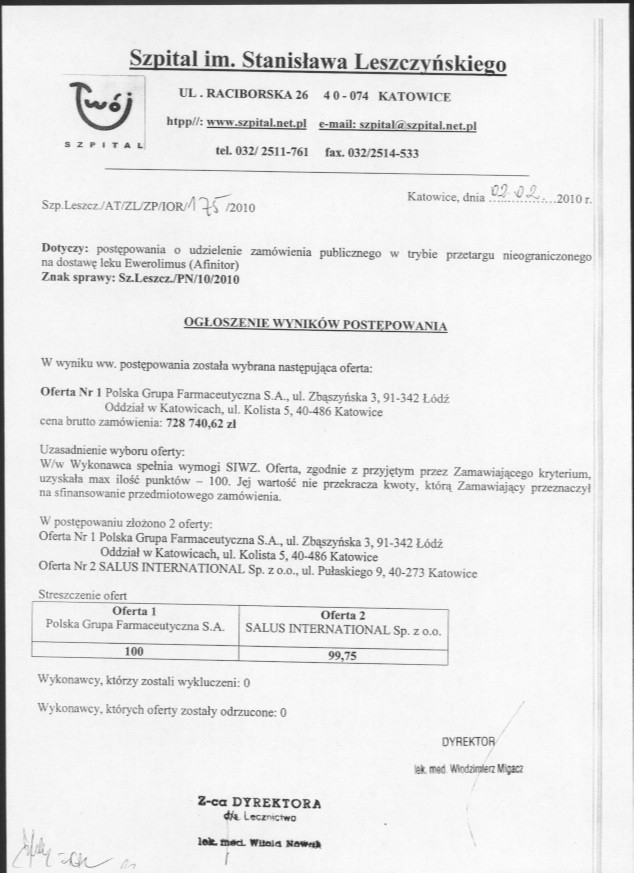 Oferty należy złożyć do dnia 28.01.2010 r. do godz. 11:00 w Kancelarii Dyrektora Szpitala w Katowicach przy ul. Raciborskiej 26.
