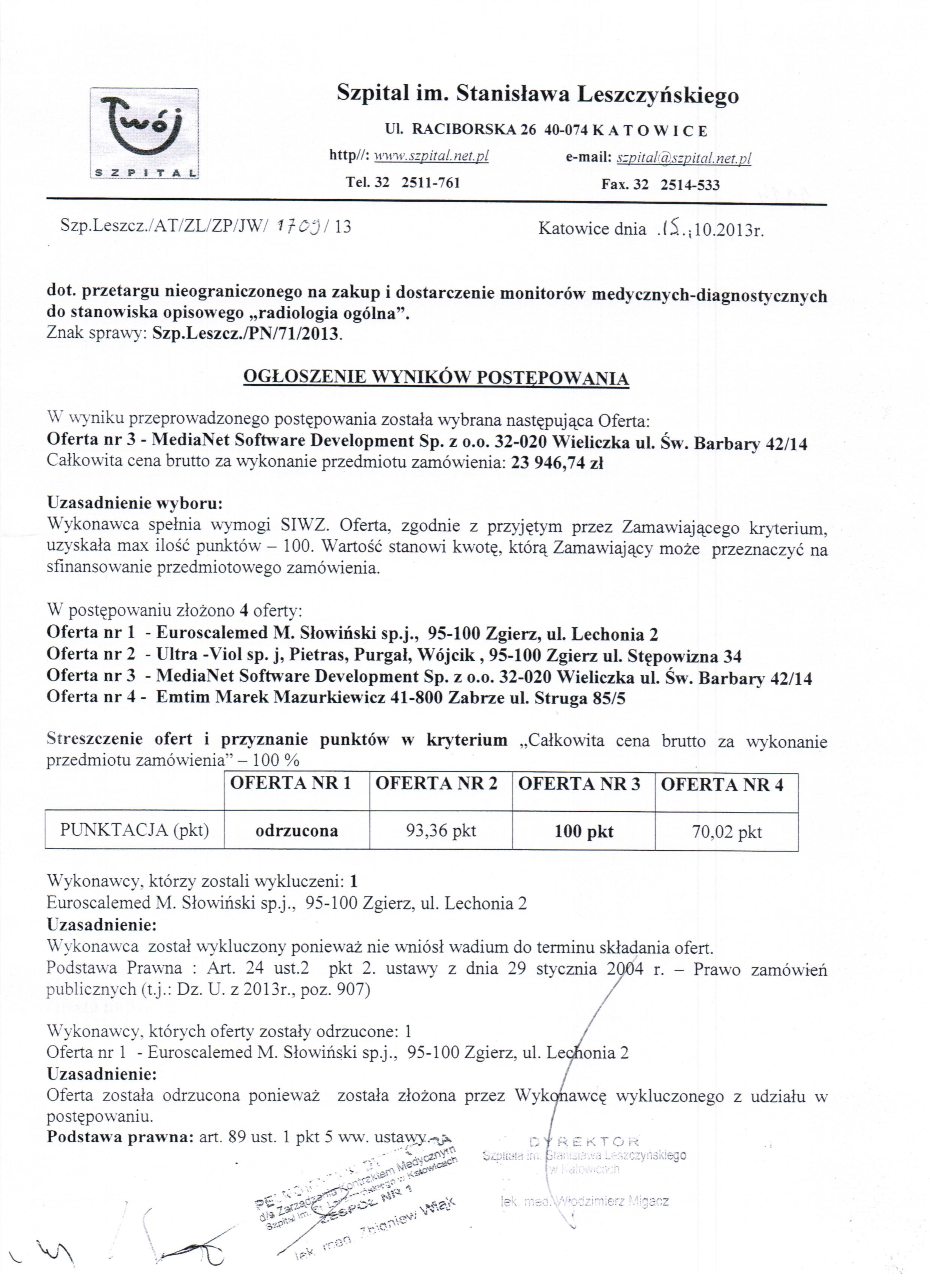 przetarg nieograniczony o wartości szacunkowej zamówienia poniżej14.000 EURO na zakup i dostarczanie monitorów medycznych – diagnostycznych do stanowiska opisowego „radiologia ogólna”.