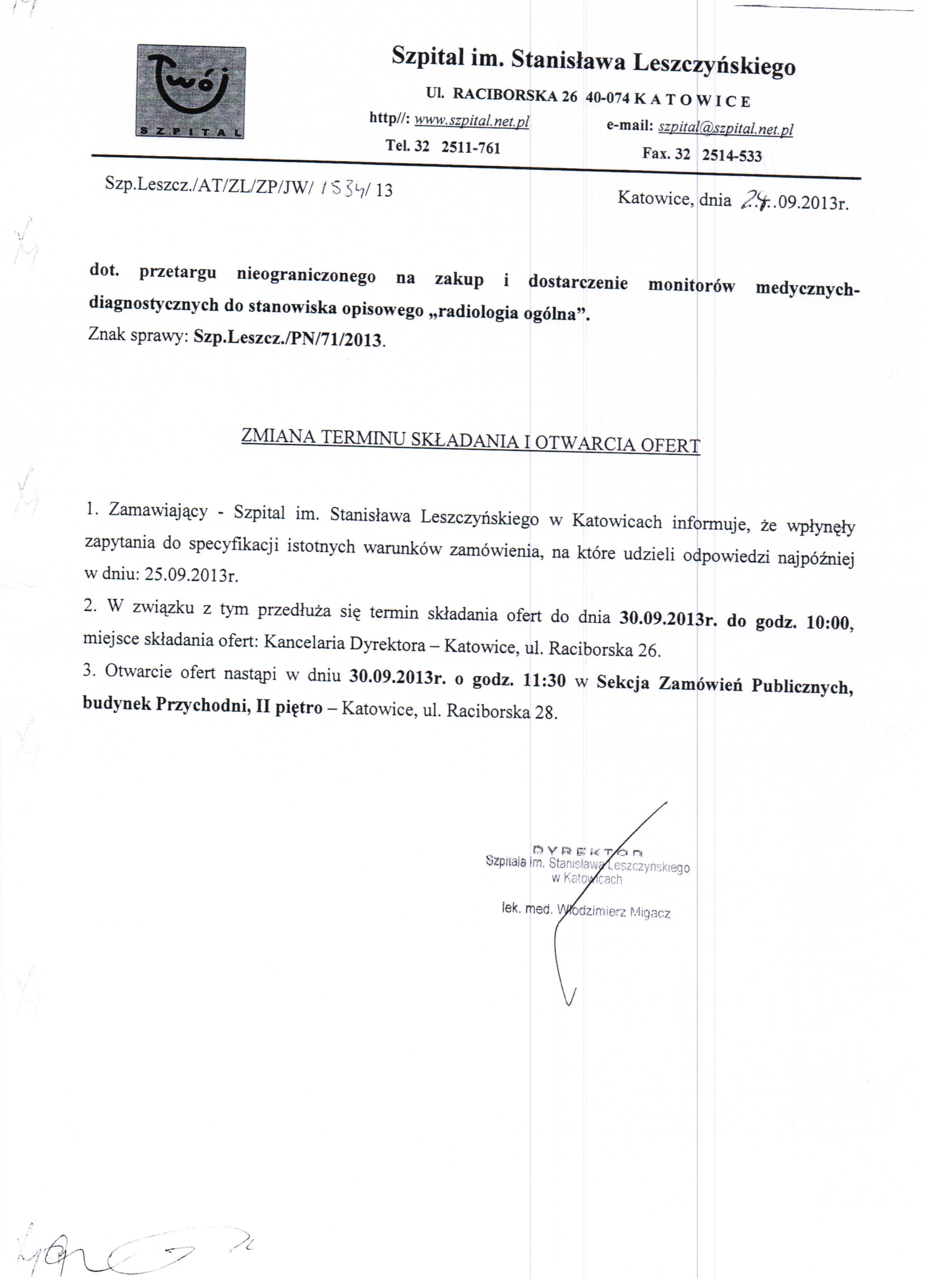 Otwarcie ofert nastąpi w dniu 25.09.2013r. o godz. 11:00 w 40– 074 Katowice, ulica Raciborska 28, budynek Przychodni, II piętro, Sekcja Zamówień Publicznych.