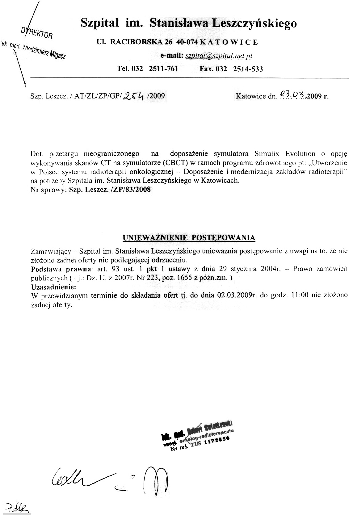 do dnia 02.03.2009r. do godz. 11.00 w Szpitalu im. Stanisława Leszczyńskiego, 40-074 Katowice, ul. Raciborska 26, w Kancelarii Dyrektora.