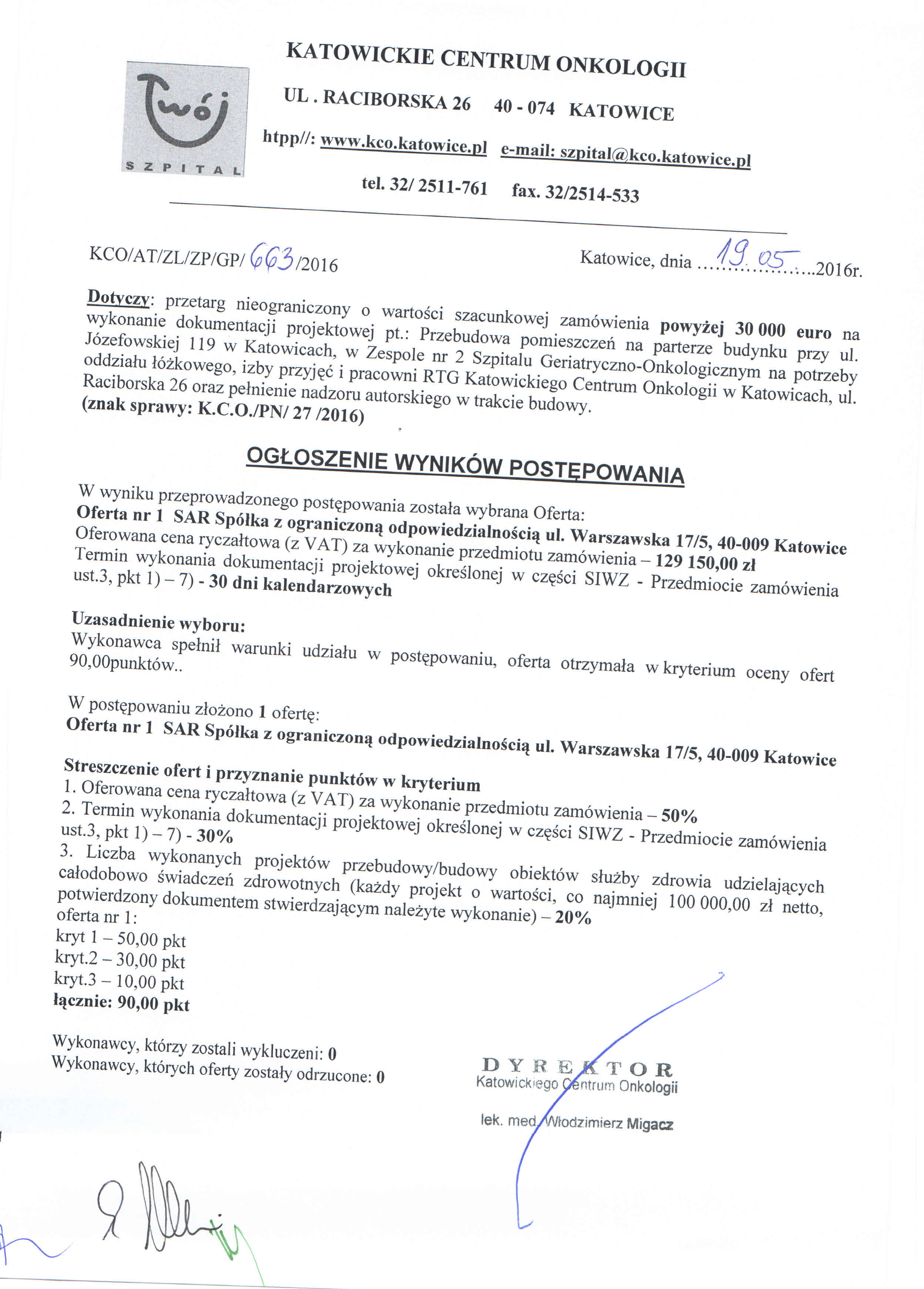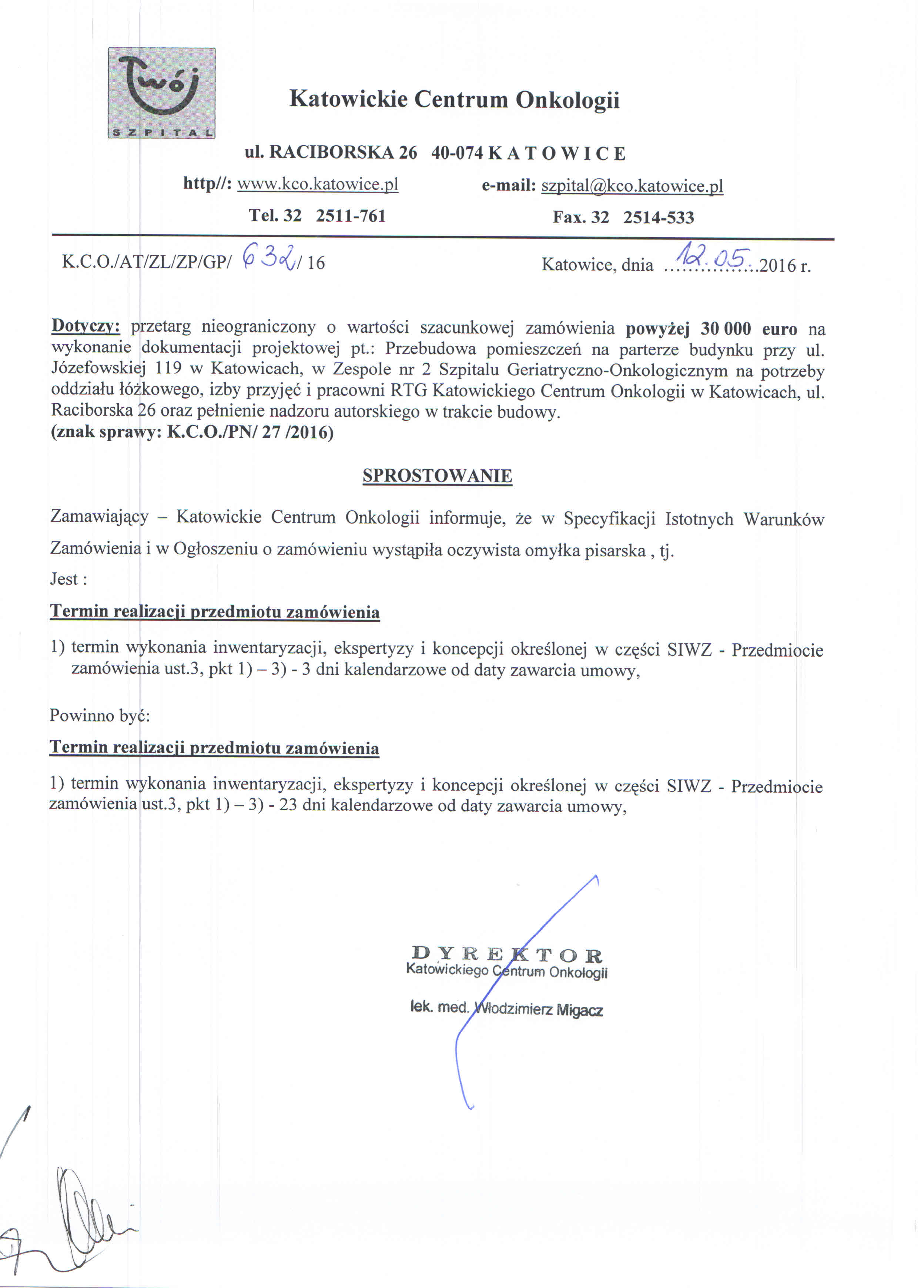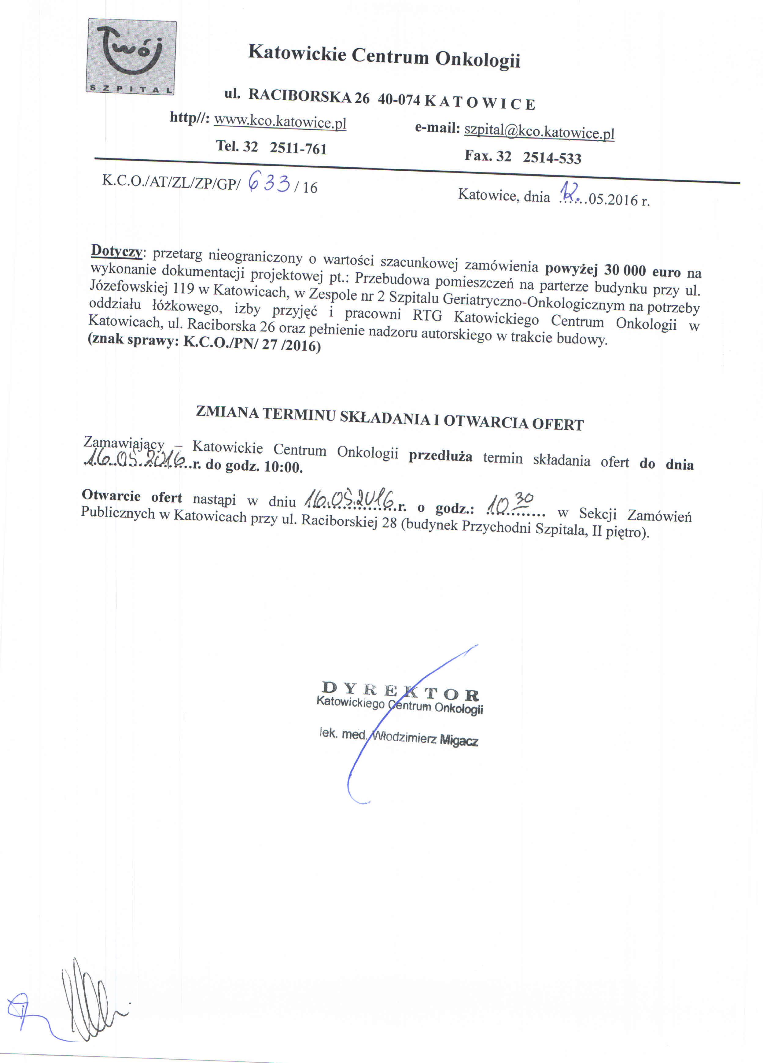 w dniu 13.05.2016r. o godz. 11:00 w Katowickim Centrum Onkologii, ul. Raciborska 28, budynek Przychodni, II piętro, Sekcja Zamówień Publicznych.