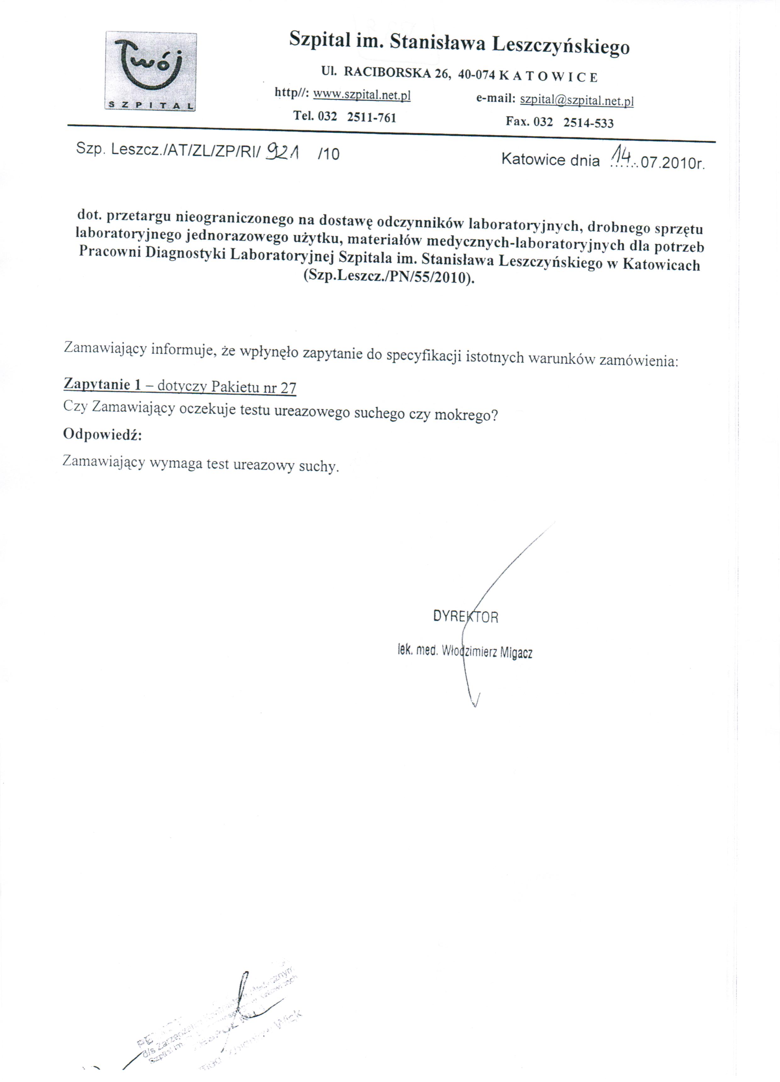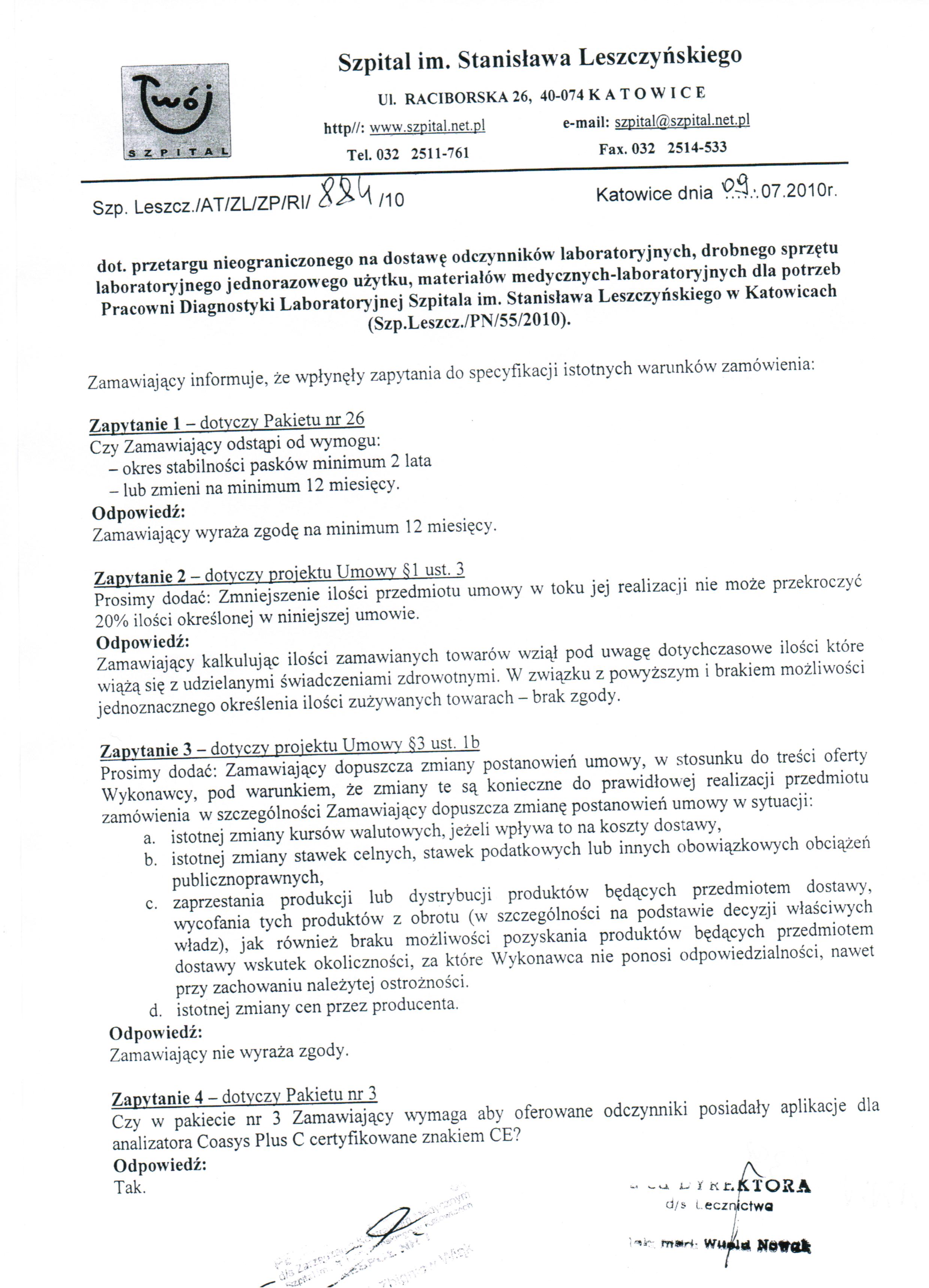 Oferty należy złożyć do dnia 16.07.2010r. do godz. 10:00 w Kancelarii Dyrektora Szpitala w Katowicach przy ul. Raciborskiej 26.