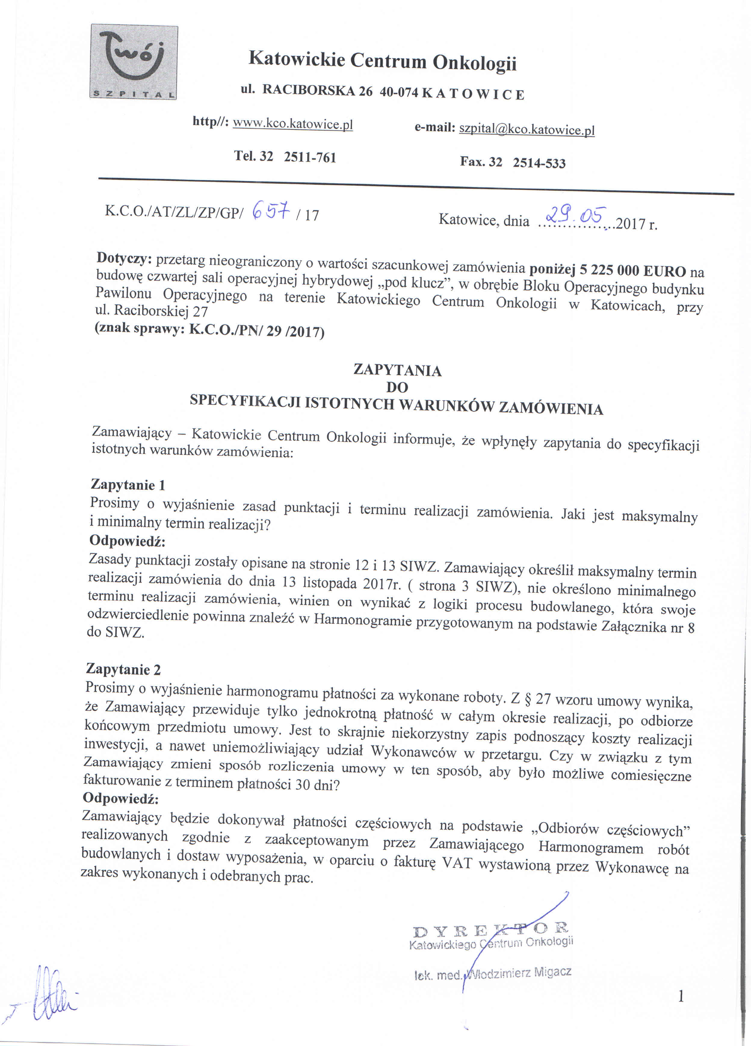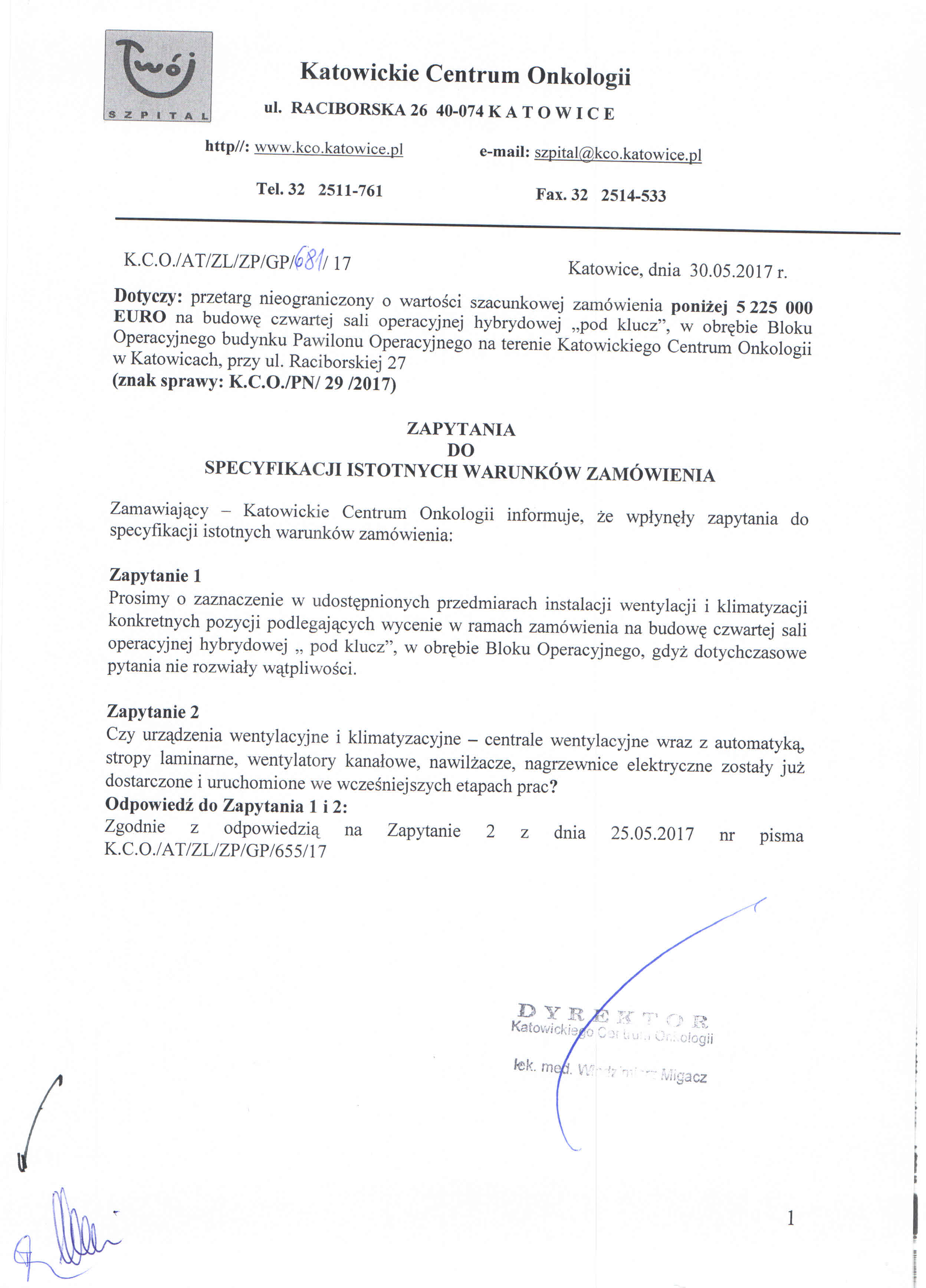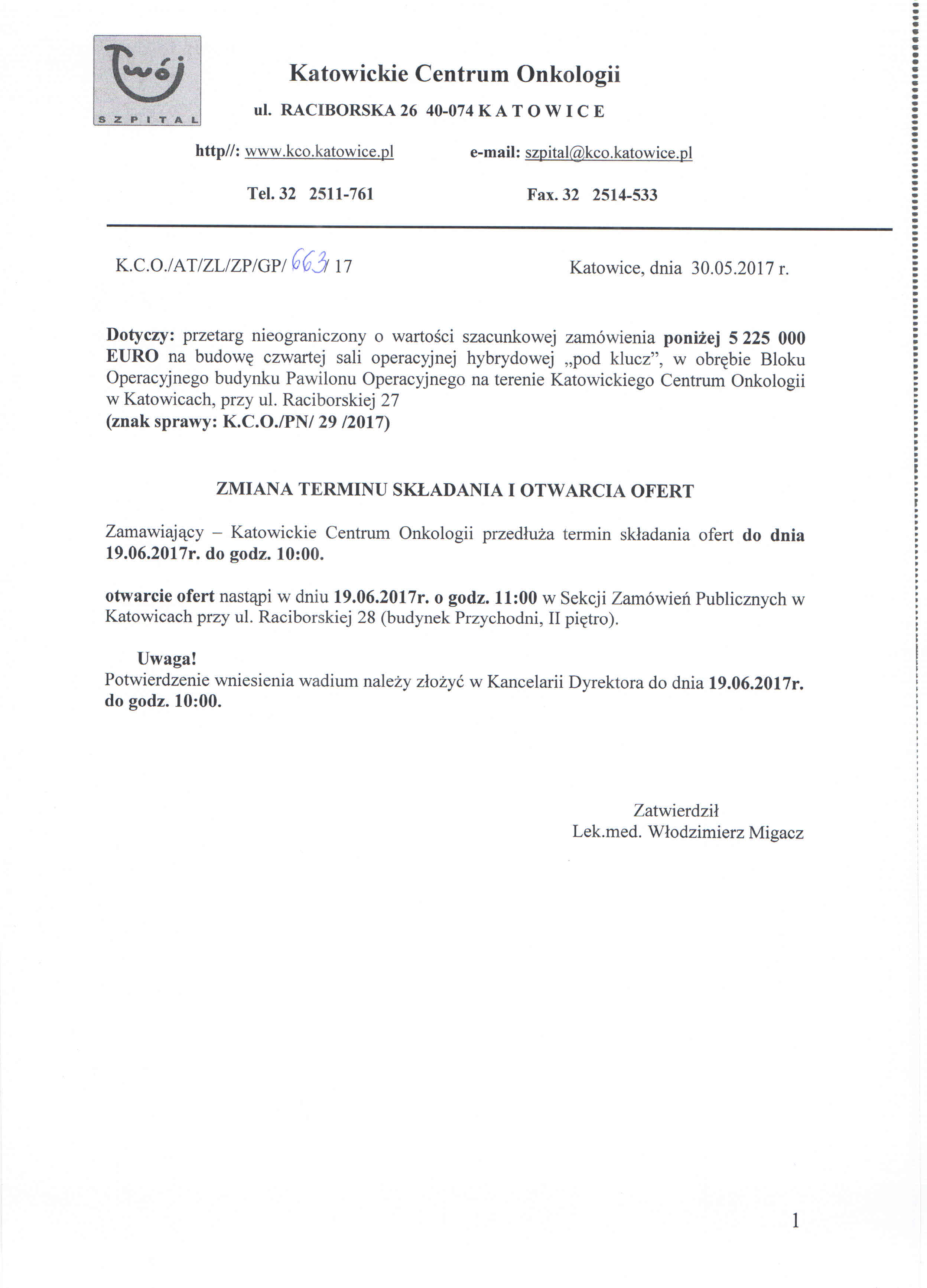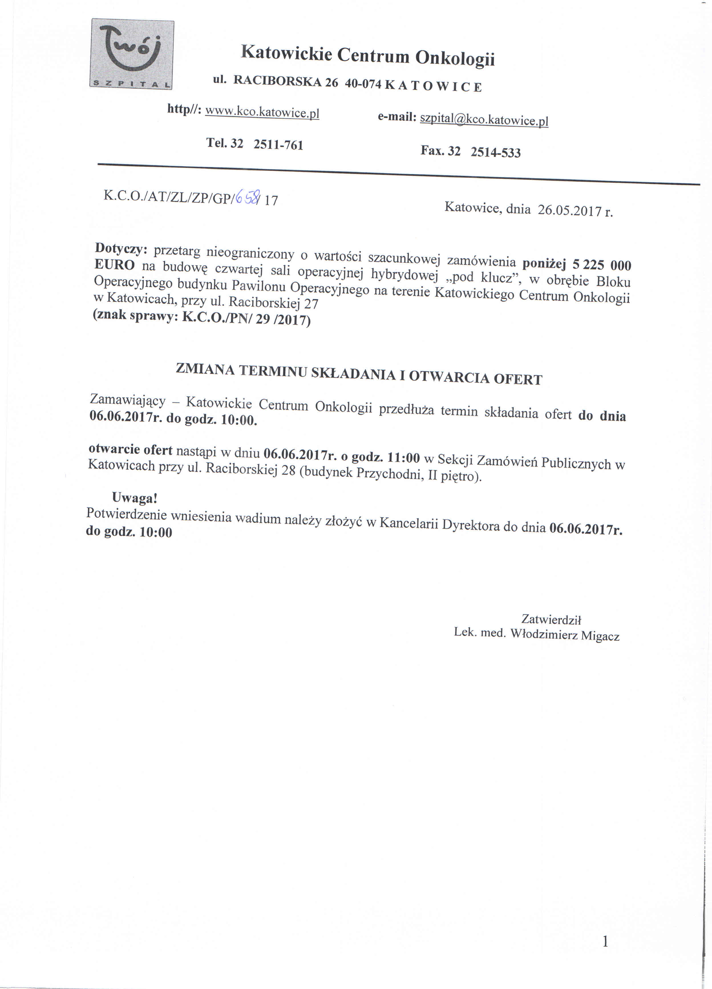 w dniu 30.05.2017r. o godz. 11:00 w Katowickim Centrum Onkologii, ul. Raciborska 28, budynek Przychodni, II piętro, Sekcja Zamówień Publicznych.