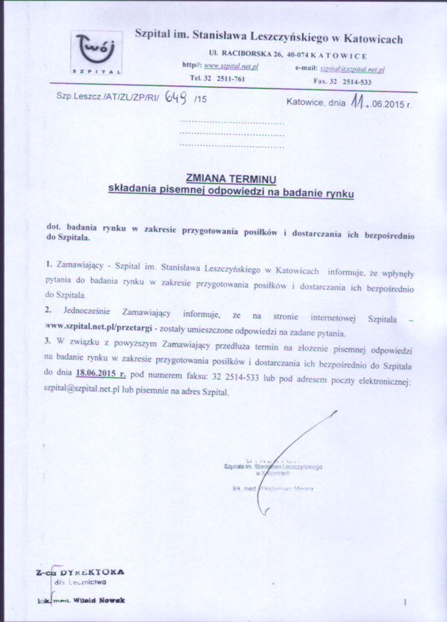 Pisemnej odpowiedzi oczekujemy do dnia 11.06.2015 r. pod numerem faksu: 32 2514-533 lub pod adresem poczty elektronicznej: szpital@szpital.net.pl lub pisemnie na adres Szpitala.