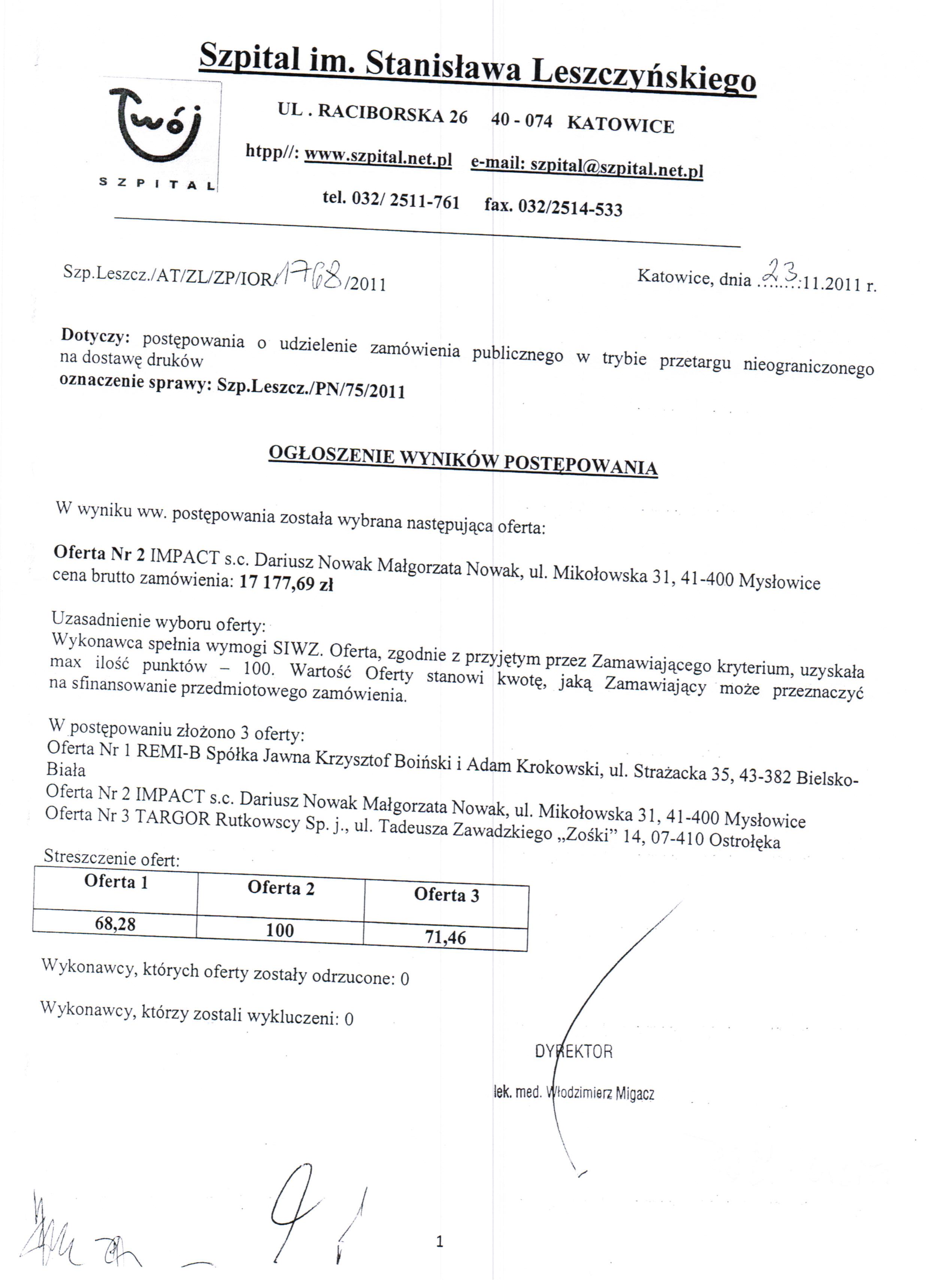 Otwarcie ofert nastąpi w dniu 09.11.2011r. o godz. 11:00 w 40-074 Katowice, ulica Raciborska 28, budynek Przychodni, II piętro, Sekcja Zamówień Publicznych.