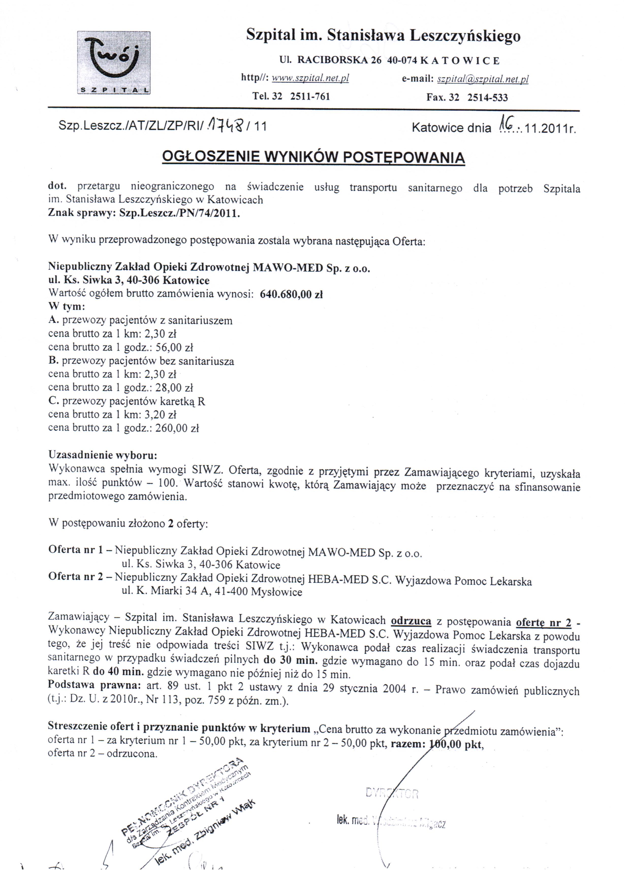 ogłasza przetarg nieograniczony o wartości szacunkowej zamówienia powyżej 14.000 EURO na świadczenie usług transportu sanitarnego dla Szpitala im. Stanisława Leszczyńskiego, przy ul. Raciborskiej 26 w Katowicach. (znak sprawy: Szp.Leszcz./ PN/ 74/ 2011)