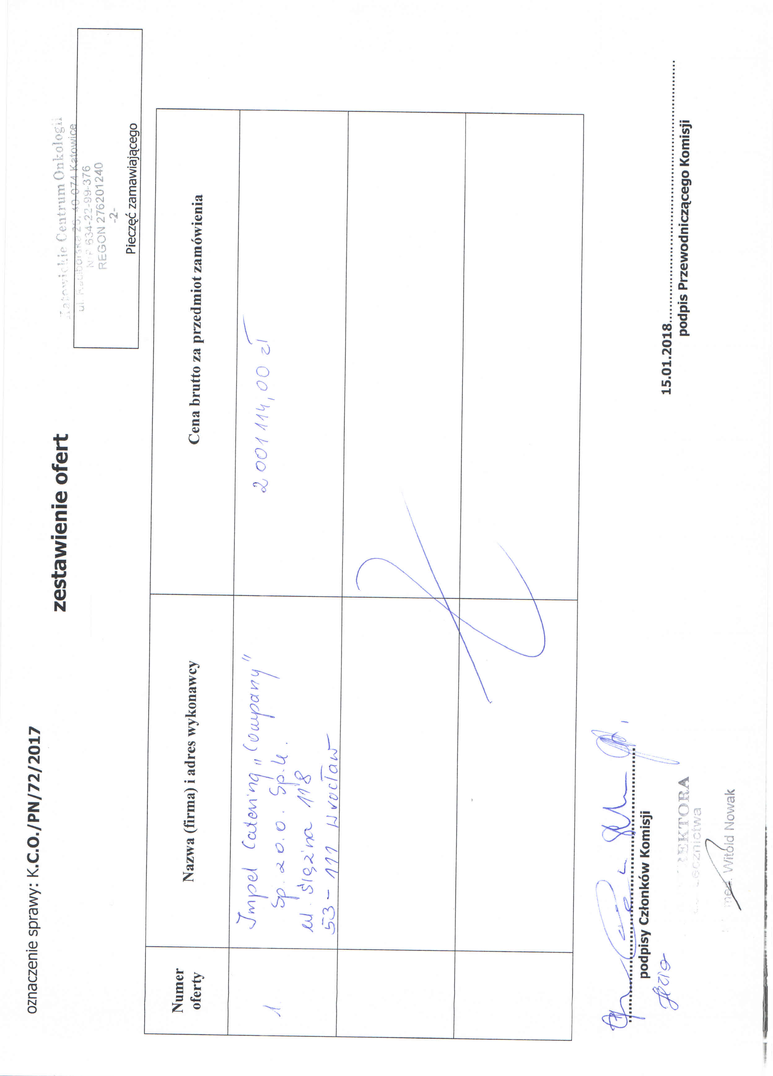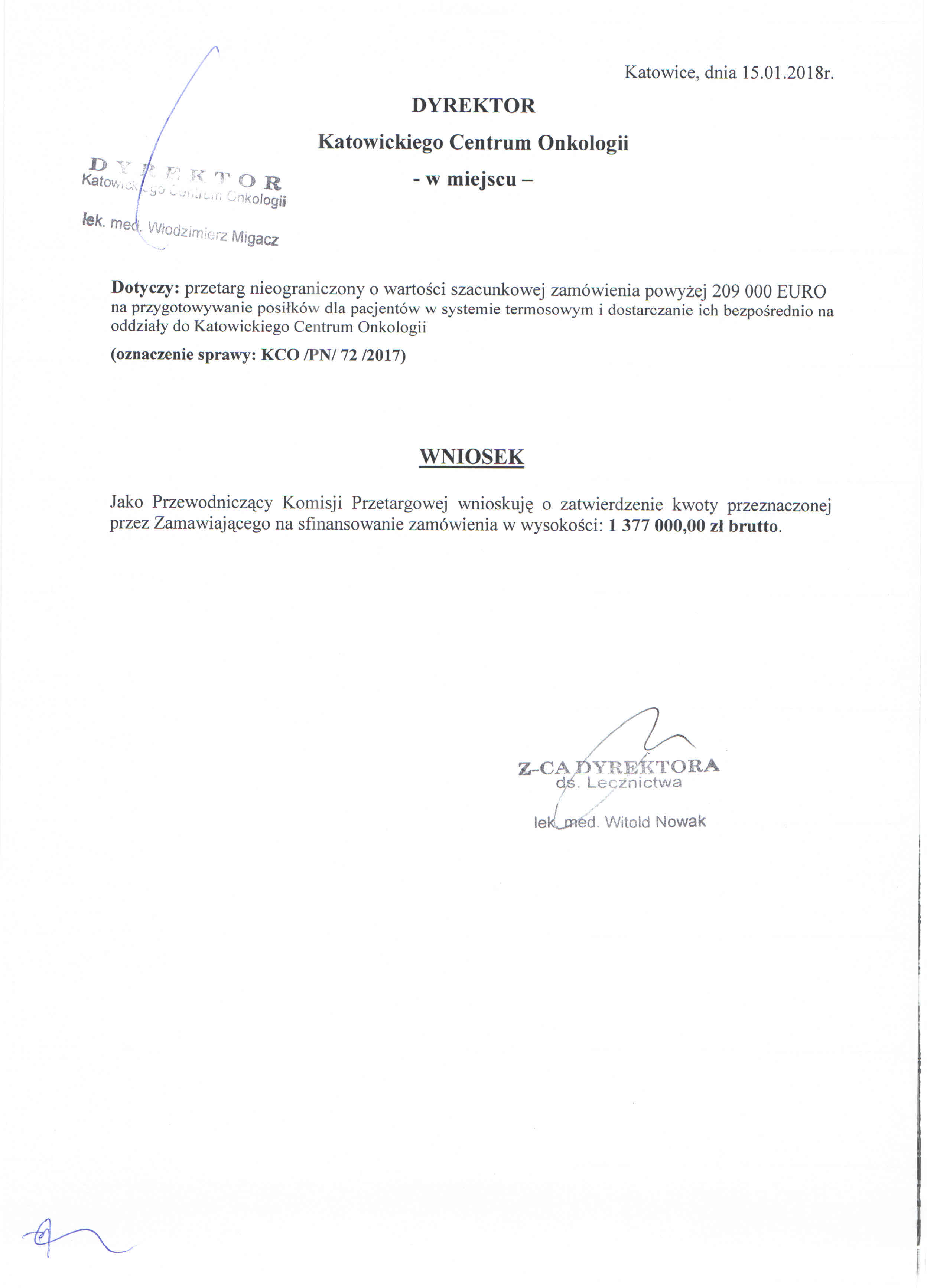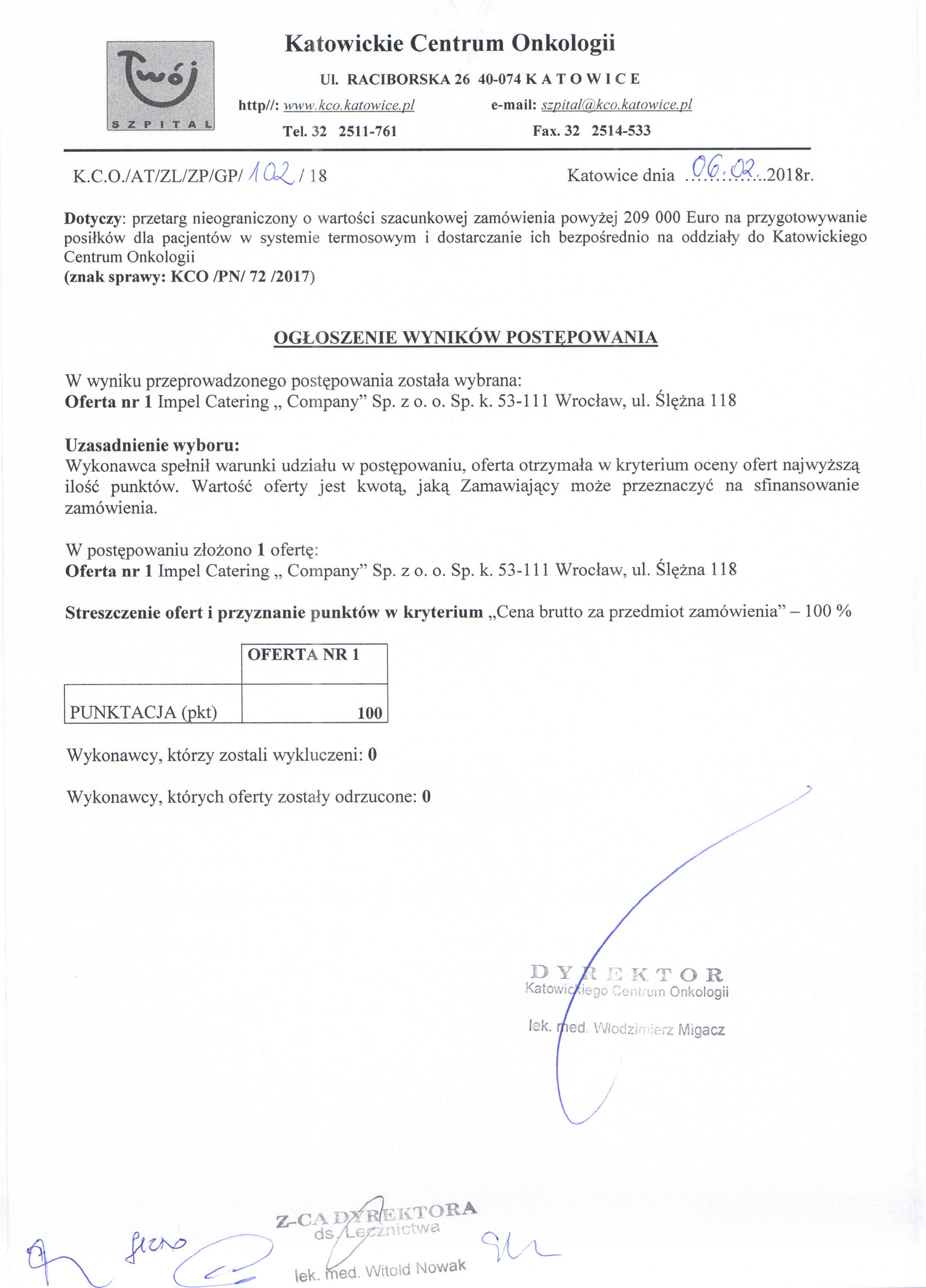 Oferty należy złożyć do dnia 15.01.2018 r. do godz. 10:00 w Kancelarii Dyrektora Katowickiego Centrum Onkologii w Katowicach przy ul. Raciborskiej 26 (I piętro).