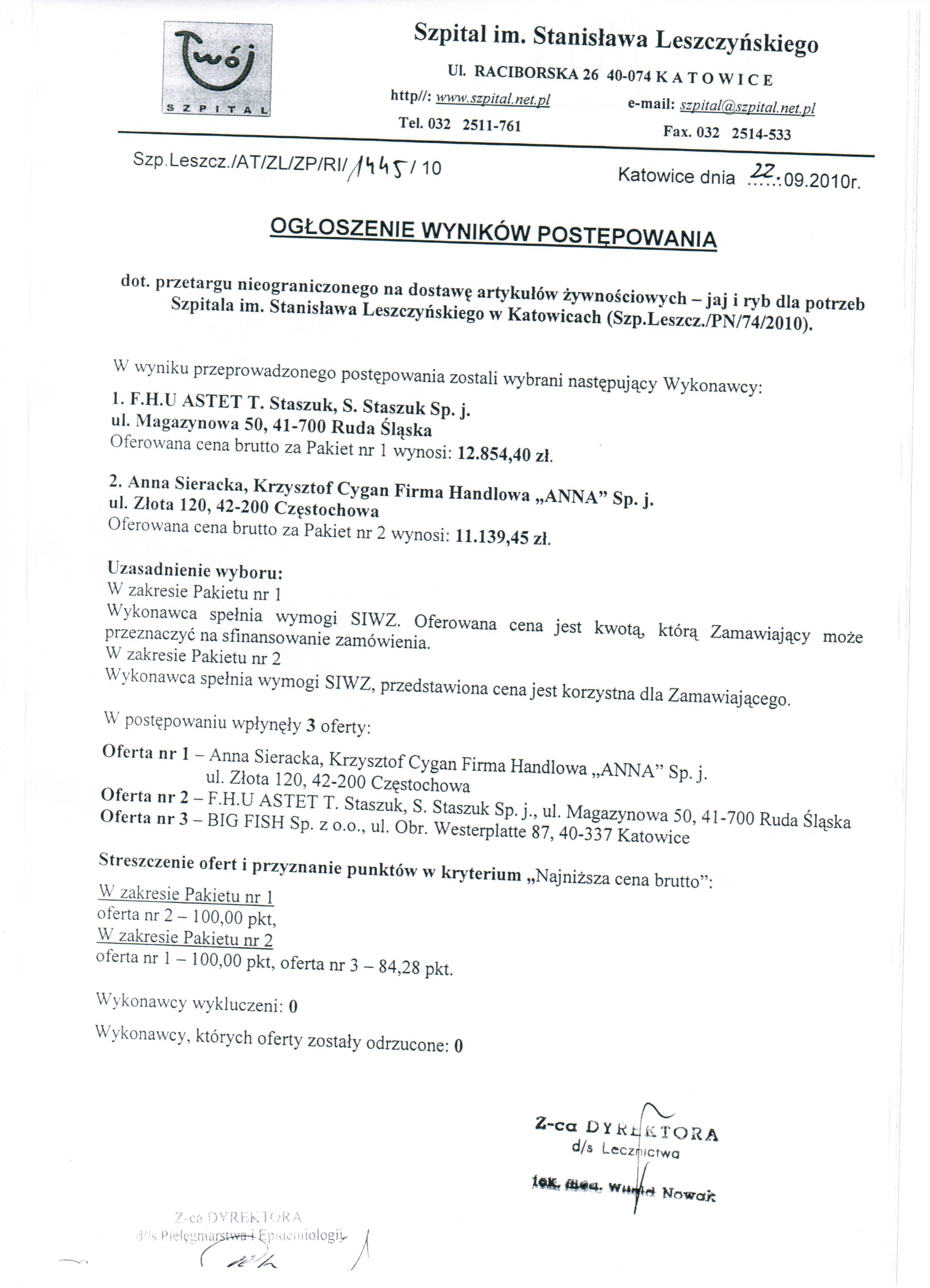 Otwarcie ofert nastąpi w dniu 10.09.2010r. o godz. 11:00 w Szpitalu im. Stanisława Leszczyńskiego w Katowicach ul. Raciborska 28, budynek Przychodni, II piętro, Sekcja Zamówień Publicznych.
